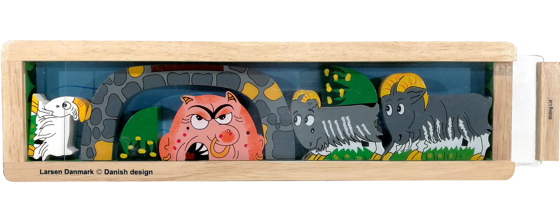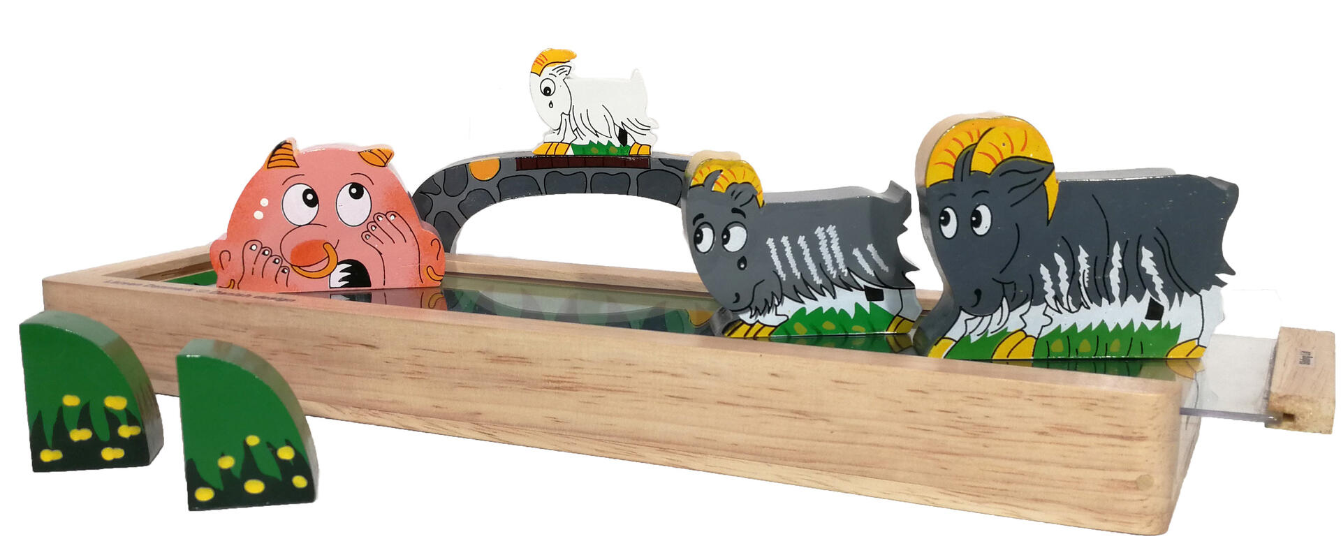 Kannellinen puulaatikko, jota voidaan käyttää pöytäteatterina. Auttaa lapsia kertomaan uudelleen klassisen tarinan kolmesta pukista tai luomaan jännittäviä uusia versioita perinteisestä tarinasta. Opettaja voi käyttää pöytäteatteria tuodakseen kerrontaan enemmän elämystä. Figuurit ovat 1,5 cm paksuja ja pysyvät pystyssä itsestään.
