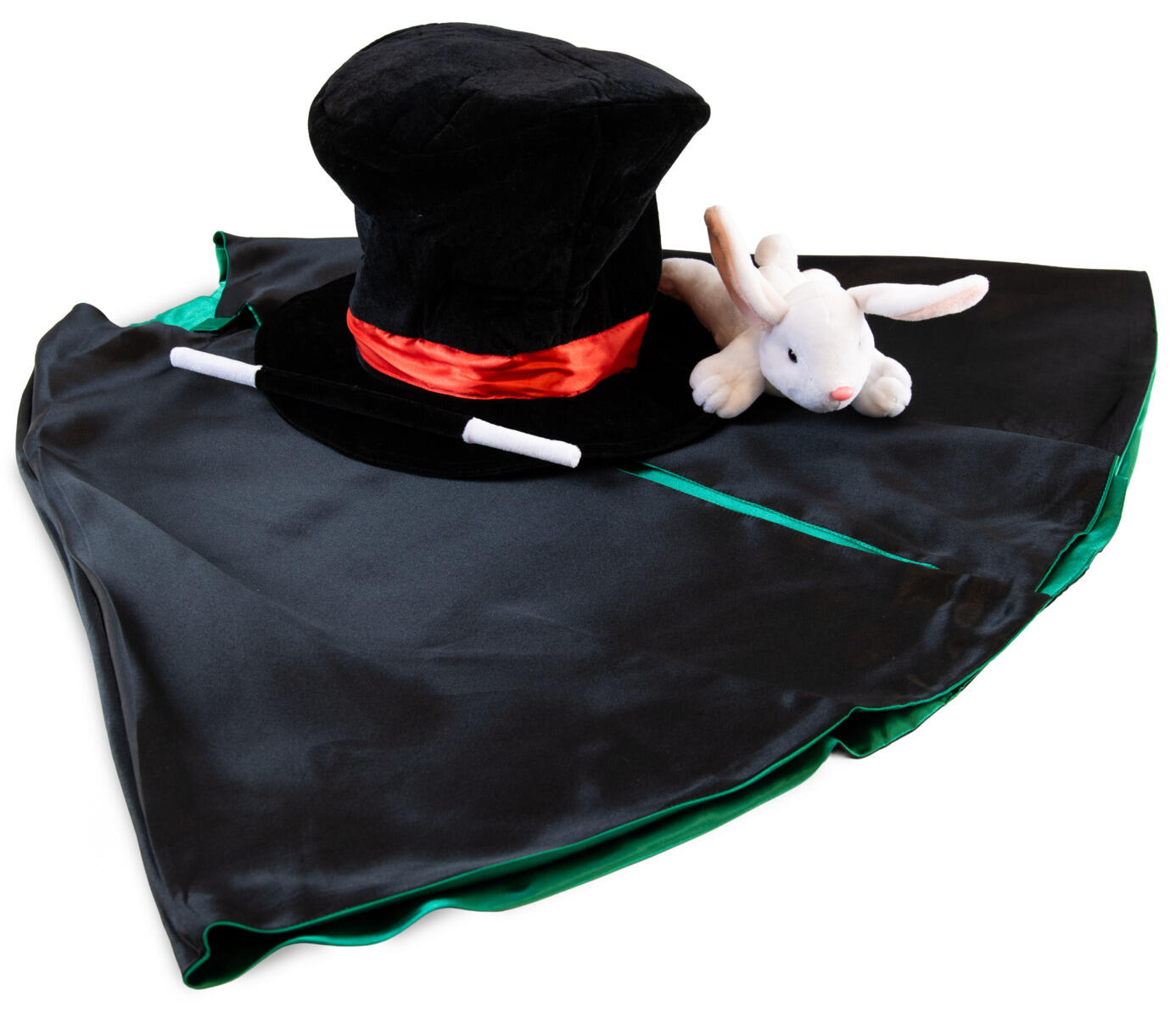 Täydellinen setti pienelle velholle. Asu sisältää taikurin hatun, viitan, naamion ja pupun. Valmistettu polyesteristä ja satiinista. Yli 3-vuotiaille.