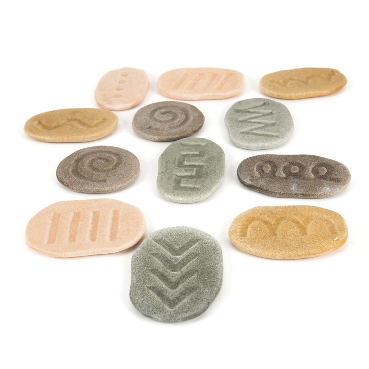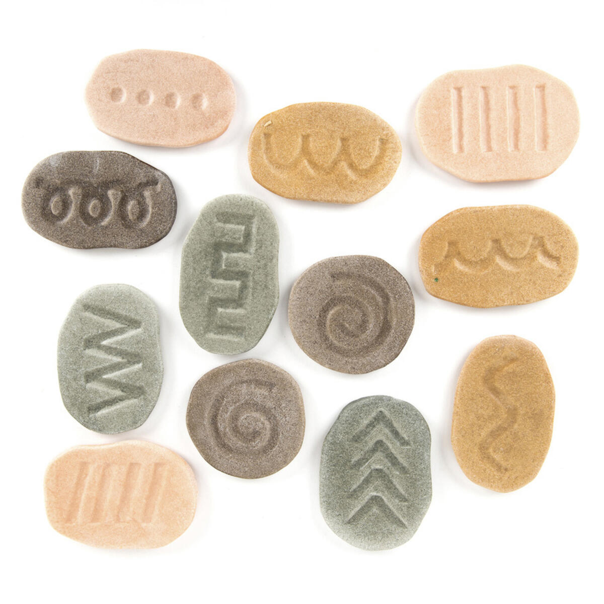 Taktiilisiin leikkikiviin on kaiverrettu erilaisia kuvioita. Kuvioiden seuraaminen sormella antaa valmiuksia kirjoittamiseen. Kiven kuvioita voi myös painaa saveen tai muovailuvahaan.Yli 3-vuotiaille.