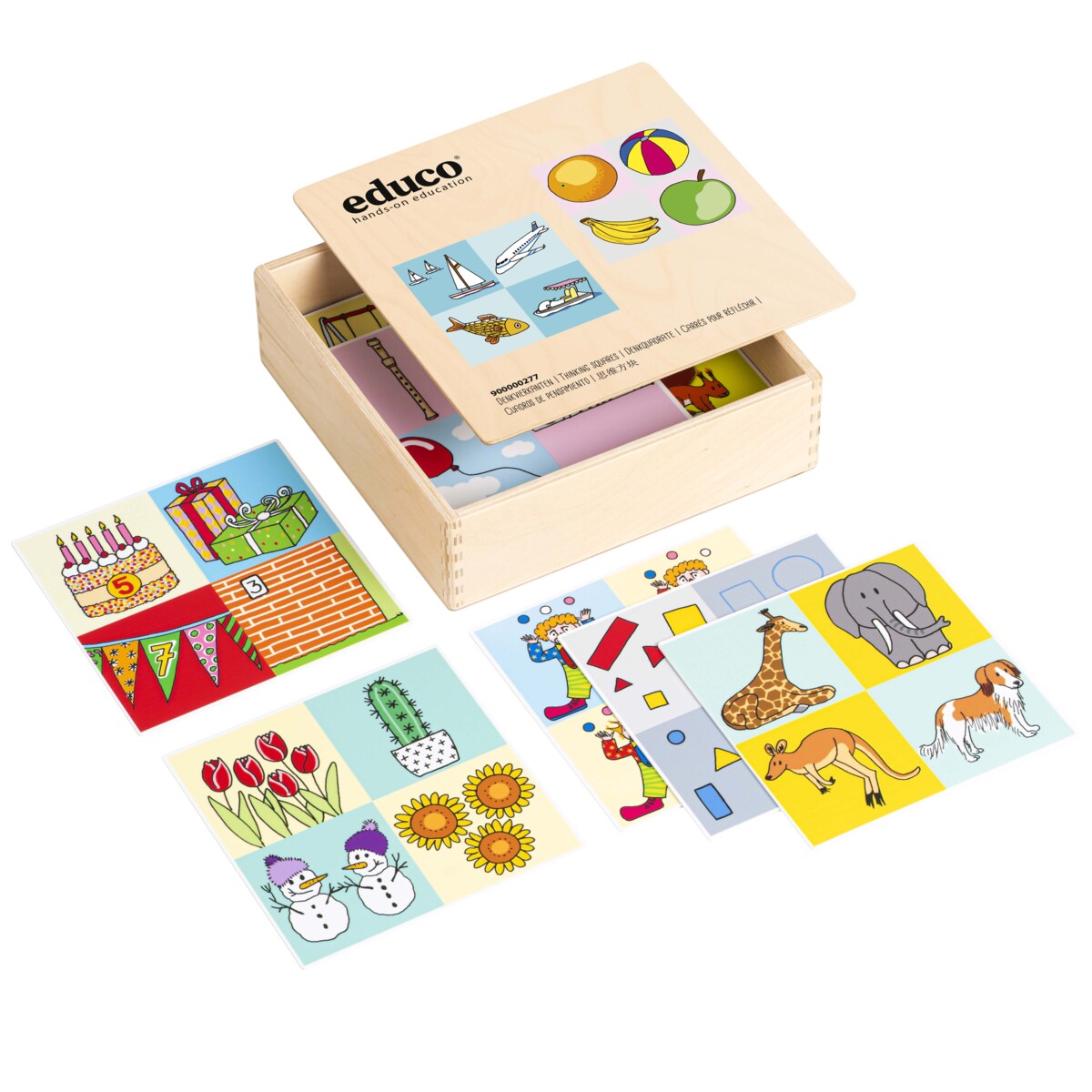 Katso kuvia ja keskustele mitkä kuuluvat yhteen ja mitkä eivät. Etsi yhtäläisyyksiä ja eroja. Stimuloi kielen kehitystä, sanastoa ja kriittistä ajattelua. Kuvissa on monia erilaisia aiheita mm. värit ja muodot, kuviot, laskeminen ja numeroiden havaitseminen. Sisältö: 24 muovista kuvakorttia ja puinen säilytyslaatikko. Puulaatikon mitat: 21,5 x 21,5 x 7 cm. Yli 4-vuotiaille.