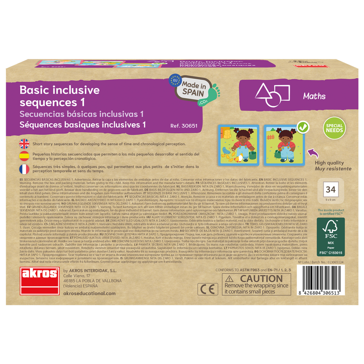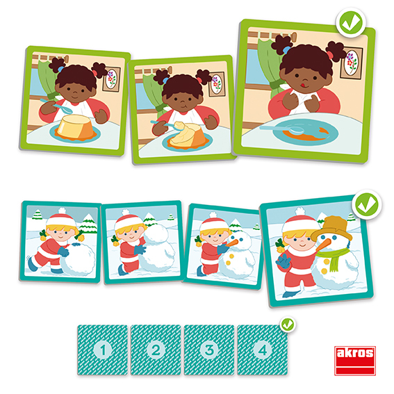 34 korttia, 9 tapahtumaa. Yksinkertaiset sarjakortit ajan hahmottamisen ja aikajärjestyksen kehittämiseen. Korttien mitat: 9 x 9 cm. Valmistettu FSC-sertifioidusta paperista. Yli 3-vuotiaille.