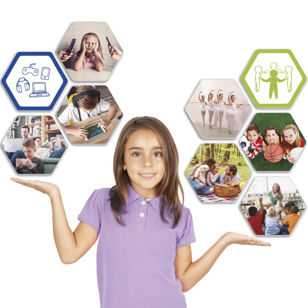 Tämä peli auttaa lapsia tunnistamaan, miten ja millaisia toimintoja he suorittavat usein sekä auttaa heitä miettimään, kuinka kyseisiä toistuvia toimintoja voi tasapainottaa. Pelin tavoitteena on tehdä lapset tietoisiksi kaavamaisen toiminnan riskeistä sekä antaa heille työkaluja vapaa-aikansa tasapainottamiseen erilaisilla toimilla. Sisältää 8 kuusikulmaista kategoriakorttia ja 42 kuusikulmaista aktiviteettikorttia. Yli 5-vuotiaille.