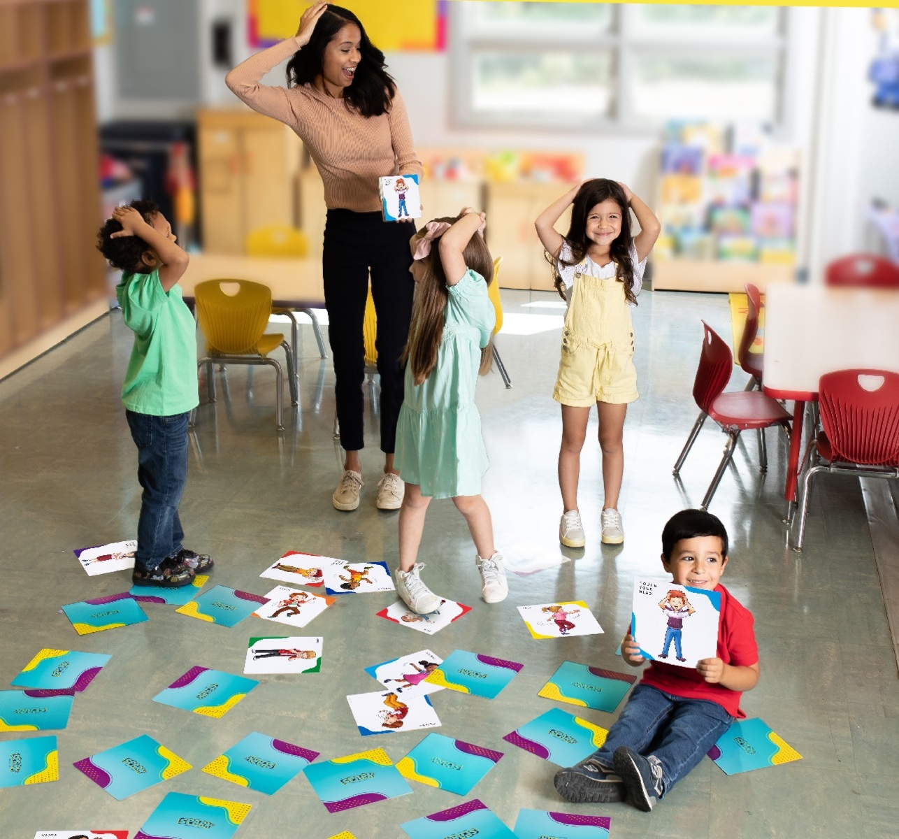 70 englanninkielistä korttia. Kortit hauskoille peleille, jotka parantavat kieltä. Esimerkkipelejä ovat vastaavien korttien löytäminen ja korttien osoittamien toimintojen toistaminen. Voidaan työskennellä verbien kanssa käyttämällä sanaa lauseessa. Sisältää 35 lattiakorttia, 35 pientä korttia sekä käyttöohjeen. Yli 2-vuotiaille.