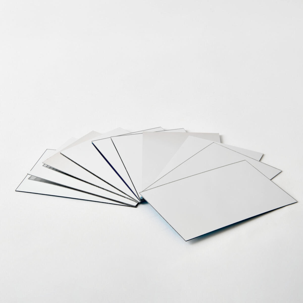 Kaksipuoliset, kunnolla viimeistellyt muoviset tasopeilit. Peilejä voi taivuttaa tai leikata halutun muotoisiksi. Voidaan käyttää myös valoon, muotoihin ja kuviin liittyvissä projekteissa. Molemmilla puolilla on irrotettava suojakalvo.