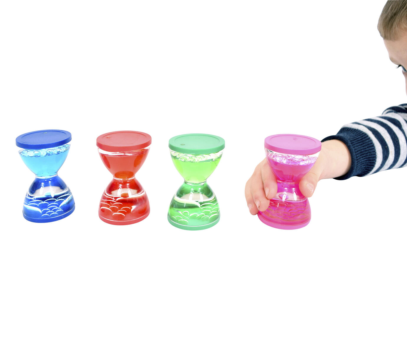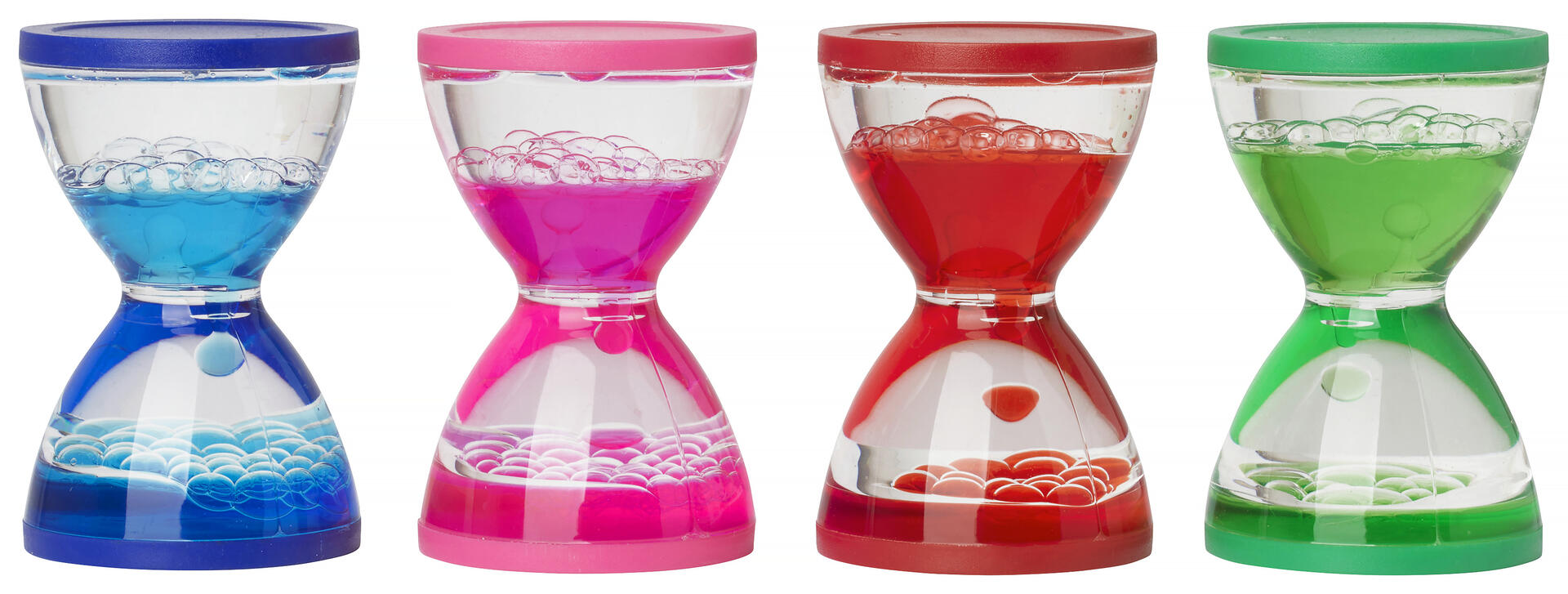 Tiimalasit geelillä, joka valuu hitaasti alas vihreänä, vaaleanpunaisena ja sinisenä. Hidas liike vangitsee huomion ja kiehtoo. Mitat: 120 x 50 mm. Yli 3-vuotiaille.