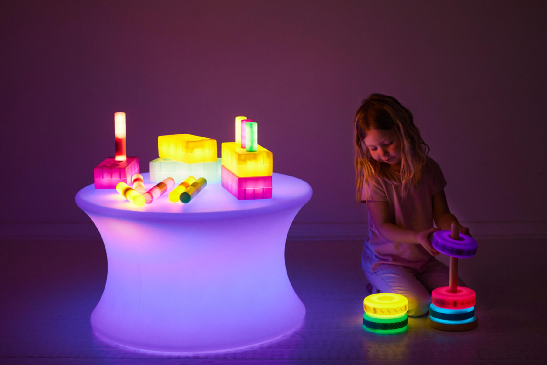 Pakkaus sisältää 12 ladattavaa, pyöreää valokiveä. Niitä voi käyttää aistien stimuloimiseen ja ne myös houkuttelevat lasta tutkimaan. Valokiviä voi pinota päällekkäin ja lajitella. Valokiven väri vaihtuu nappia painamalla. Värin voi asettaa vaihtumaan automaattisesti tai valita pysyvästi joku väri. Latausaika on 4 tuntia ja toiminta-aika 10 - 12 tuntia. Kolme eri kokoista kiveä: ø 4,5 – 15 cm. Materiaali on ABS-muovia. Yli 1-vuotiaille.