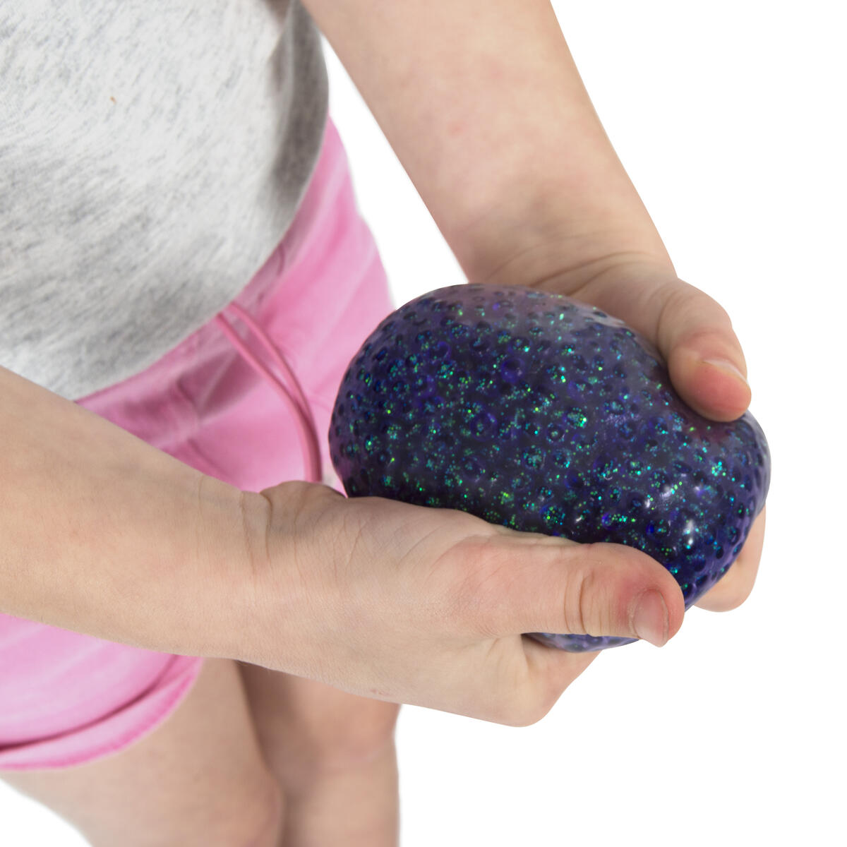 Sensoriset, helmillä ja glitterillä täytetyt puristelupallot rentouttavat ja vahvistavat käsiä. Mitat: 7 cm, paino 130 g. Materiaali: TPR-muovi.