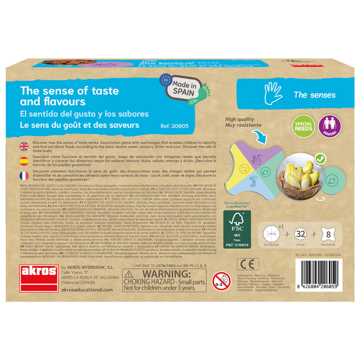 Assosiaatiopeli, jossa on kauniita valokuvia ruoasta eri muodoissa. Nämä yhdistetään sitten eri makuihin: makea, suolainen, hapan ja karvas. Sisältää 8 keskipalaa (8 cm) ja 32 valokuvaa ruoasta (5 cm). FSC-sertifioitu. Yli 3-vuotiaille.