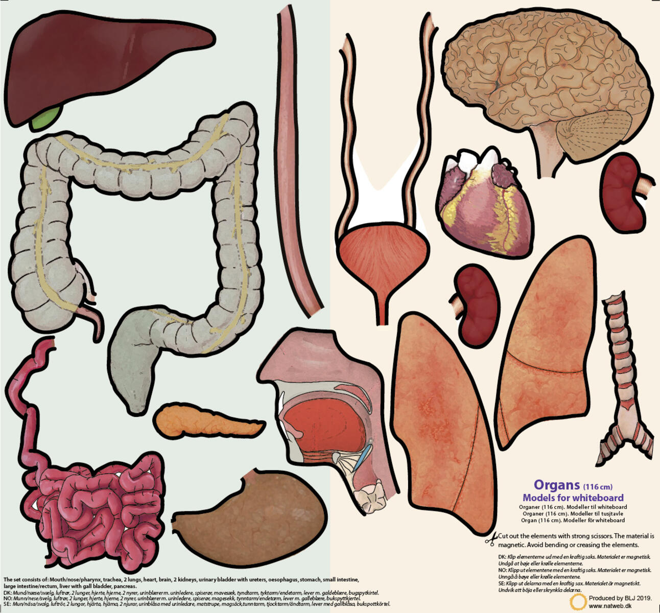 Materiaali on magneettinen, joten sitä voidaan käyttää esimerkiksi valkotaululla. Itse leikattava setti koostuu 15 osasta. Malli on tarkoitettu luonnontieteiden opetukseen, mutta sitä voidaan käyttää myös biologian tunneilla. Elinmallia voidaan käyttää itsenäisesti tai yhdessä vartalon (164479) kanssa.