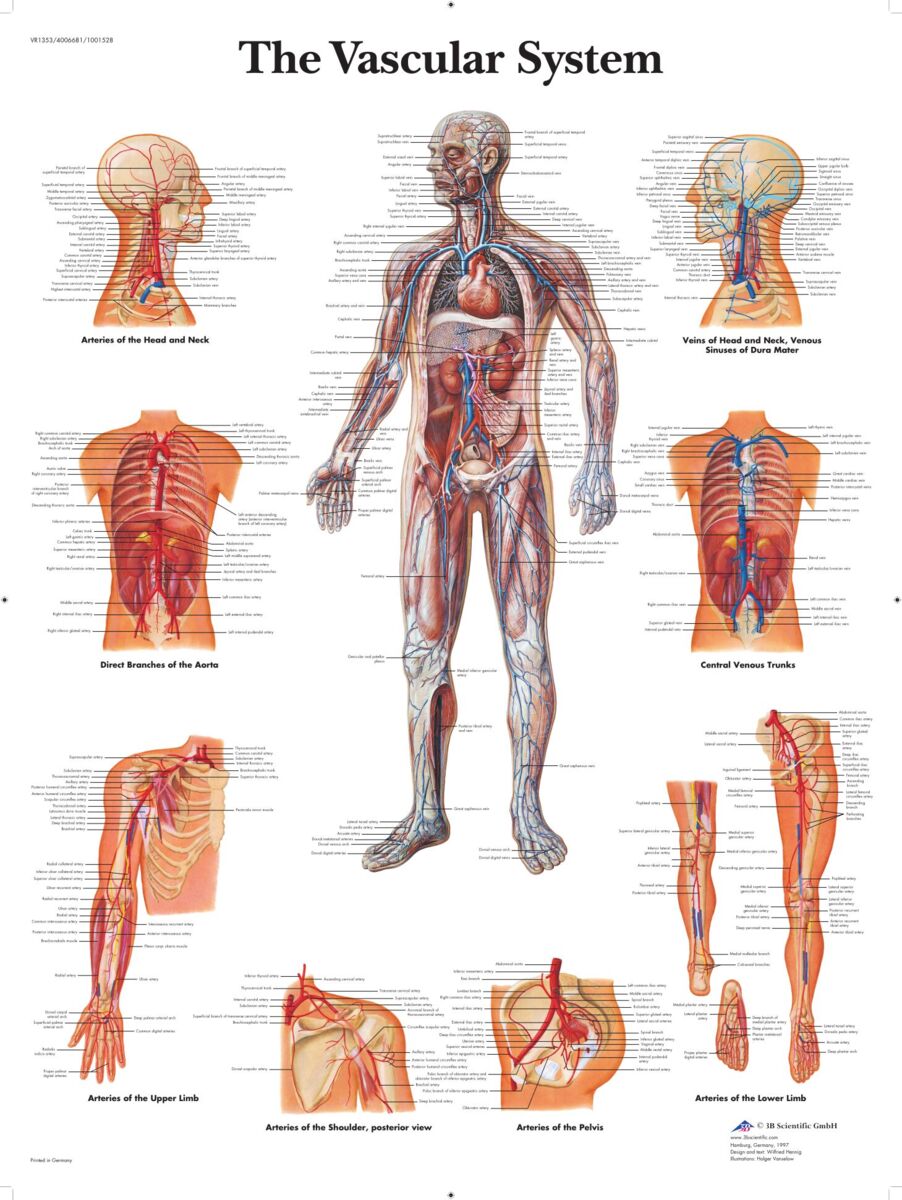 Laminoitu anatominen juliste, joka kuvaa ihmisen verisuonijärjestelmää värikkäillä yksityiskohdilla. Kuvassa on korostettuna kaikki tärkeät verenkierron toiminnot, ja on siksi hyvä lisä terveysasemille ja luokkahuoneisiin. Painettu 200g UV-kestävälle paperille ja laminoitu (75 µm) molemmilta puolilta, mikä tekee siitä tukevan. Ei haalistu auringossa. Laminointi tarkoittaa myös sitä, että pinnalle voidaan kirjoittaa ei-pysyvällä kynällä. Englanninkielinen teksti. IS-VET.