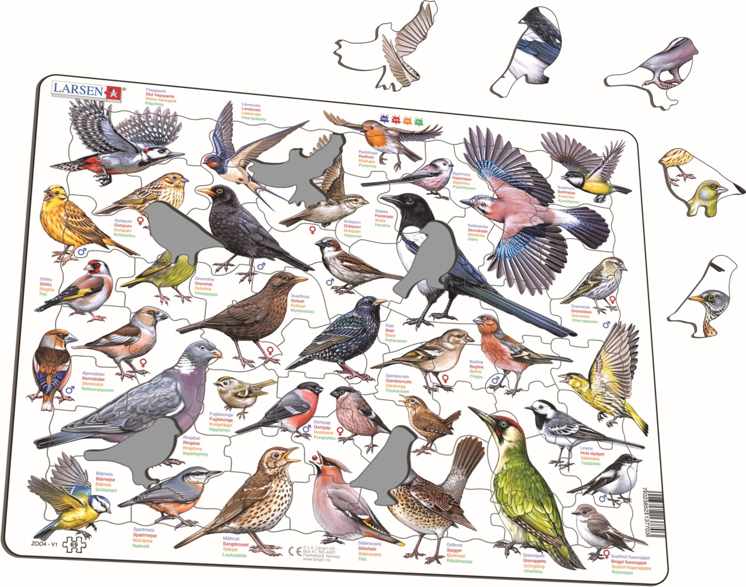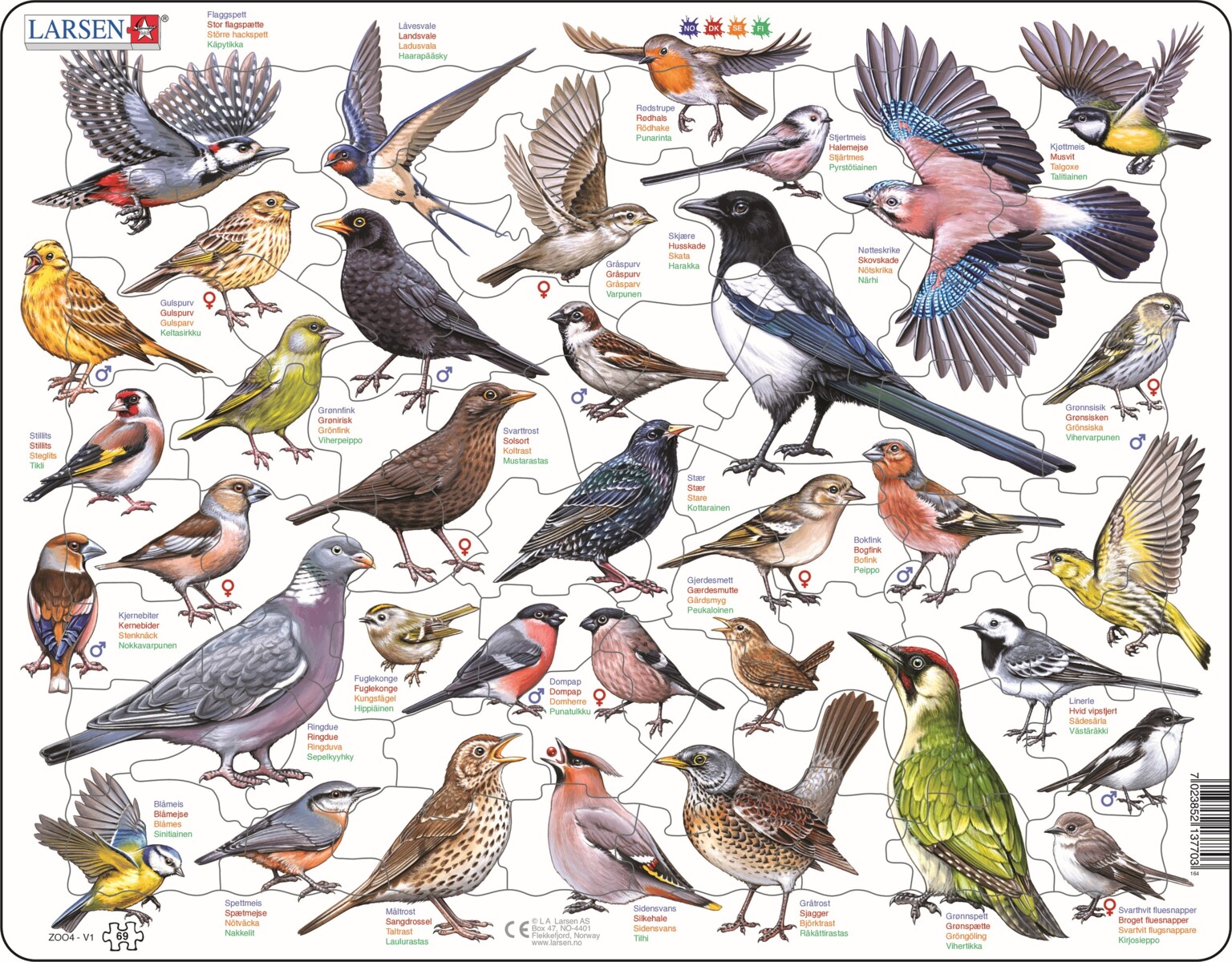 69 palaa. Opettavainen lintupalapeli, jossa on 36 kaunista piirrosta linnuista, jotka saatat tavata hyvin lähellä asuinpaikkaasi. Joskus samasta lajista on kaksi kuvaa, kun koiras ja naaras näyttävät erilaisilta. Kuvien vieressä on lajien nimet norjaksi, tanskaksi, ruotsiksi ja suomeksi. Mitat: 36 x 28 cm. Valmistettu FSC-merkitystä puusta.