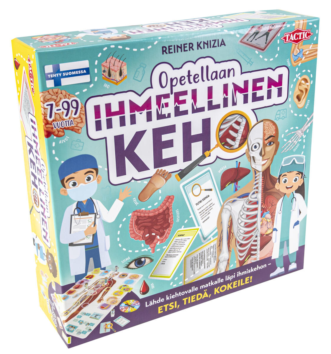 Liity seuraamme kiehtovalle matkalle ihmiskehon läpi. Ensimmäisenä maaliin saapuvasta tulee lääkäri. Liikuta hahmoasi pelilaudalla, vastaa hauskoihin kysymyksiin ihmiskehosta ja sen toiminnasta sekä kokeile itse erilaisia fyysisiä harjoituksia. Jos suoritat tehtävät, etenet matkallasi kohti lääkärin uraa, kun taas muut pelaajat haluavat ohittaa sinut. 2-5 pelaajalle. Peliaika noin 20 minuuttia. Valmistettu FSC-merkitystä kartongista. Suositellaan yli 7-vuotiaille.