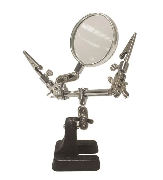 Käytännöllinen juotosjalusta/apukäsi kahdella kiinnityspuristimella ja 2,5-kertaisella suurennuslasilla. Kätevä mm. juotos-, asennus- ja korjaustöissä.