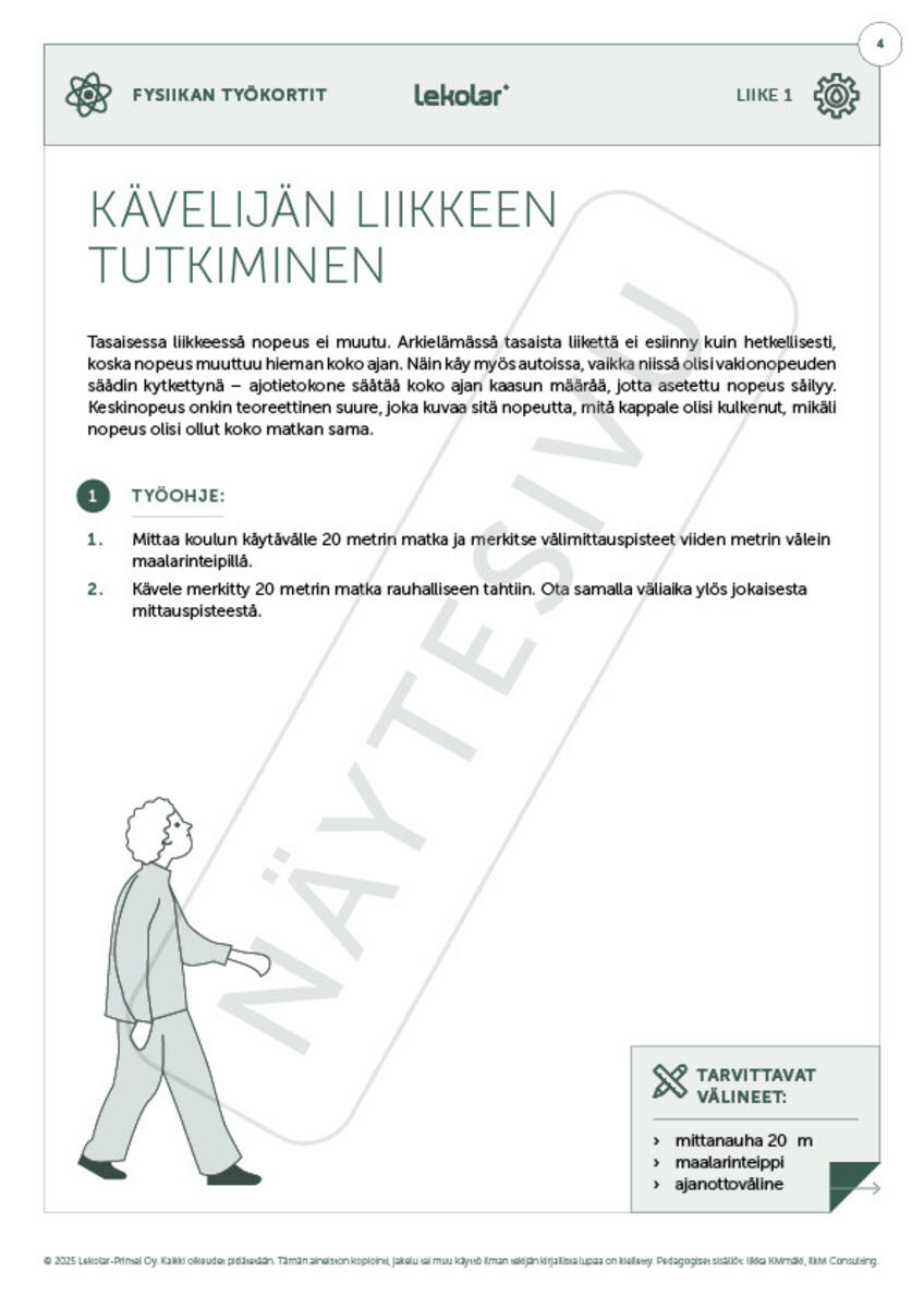 Oppilastyösarjassa on noin 20-30 erilaista työohjetta oppilaille sekä opettajan materiaali, jotka perustuvat opetussuunnitelman fysiikan sisältöihin. Oppilastyösarjan avulla oppilaat voivat tutkia liikettä, voimaa, väliaineen vaikutuksia, kitkaa, tiheyttä, nostetta, energiaa, työtä, tehoa, tasapainoa ja painetta, sekä tarkastella yksinkertaisten koneiden toimintaperiaatteita. Oppilastyösarja on ideaali parityöskentelyyn, jolloin 16 oppilaan ryhmäkoon toteutessa luokkaan tarvitsee kahdeksan oppilastyösarjaa. Halutessaan opettaja voi myös demota töitä oppilaille. Oppilastyösarjojen avulla opettajan aikaa vapautuu irtotavaroiden keräämisestä ja jakamisesta itse opettamiseen ja oppilaiden ohjaamiseen. Oppilastyösarja sisältää jousivaakoja, eri kokoisia punnuksia, kaltevan tason, vaunun kaltevalle tasolle, kitkakappaleen, suorakulmaiset eriaineiset särmiöt, sauvamagneettiparin, rautakuulia, pomppupallon, rullamitan, tasapainokappaleen sekä vanurullapalan. Työohjeiden ja sisällön kehittyessä, kaiken tarvittavan täydennyksiin löydät Lekolarilta. Oppilastyösarjoja saatavilla myös lämmön (163492), aaltoliikkeen (163581) ja sähkön (163598) sisältöjen opettamiseen.