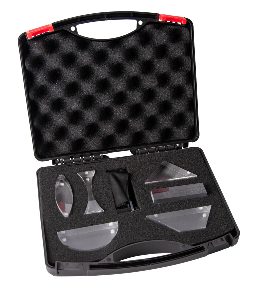 7 optista mallia, 3 linssiä, 3 prismaa, peili (kovera/kupera/suora), 1 kyvetti ja jalusta astelevyllä.
