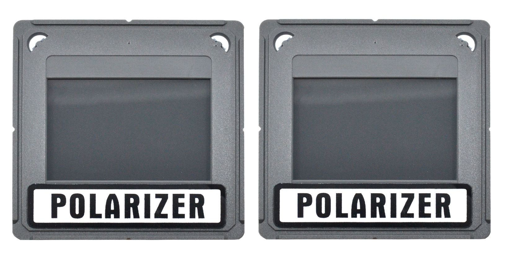 Polarisaatiofiltteripari vahvasta muovista. Mitat: kalvo 45 x 23 mm ja muovikehys 50 x 50 mm.