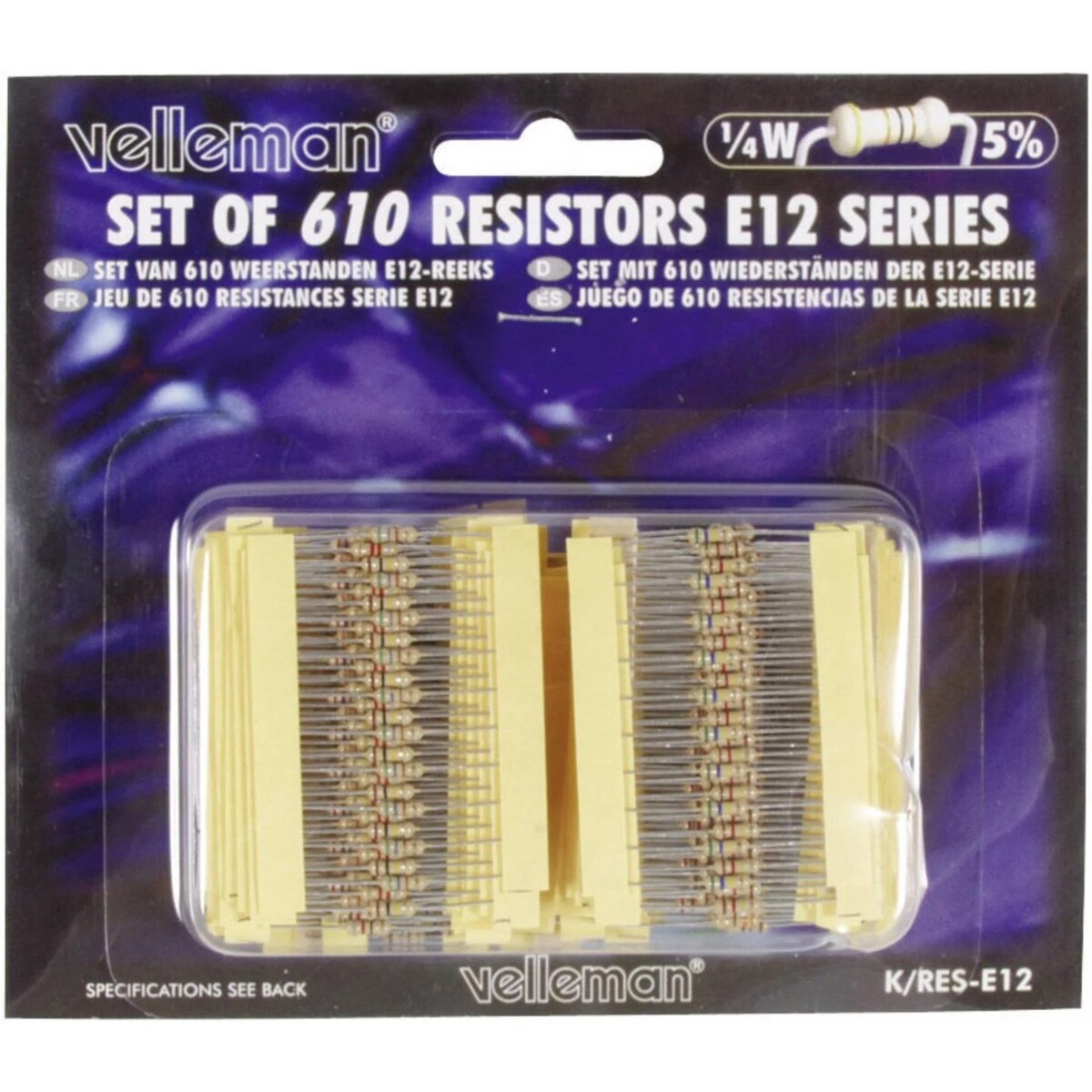61 erilaista vastusta arvolla 10 Ω - 1 MΩ (10 kpl kutakin). Tyyppi: K/RES-E12. Toleranssi ± 5 %. Kantavuus: 0,25W. Voidaan käyttää -55 - 155 °C lämpötilassa.
