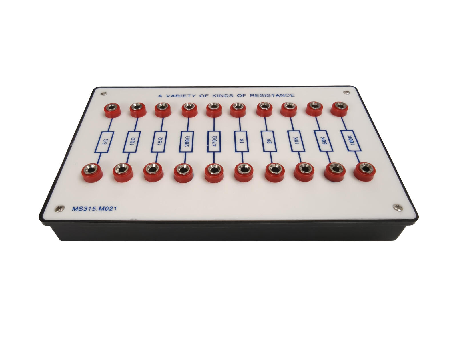 10 kpl erisuuruisia vastuksia, jotka on asennettu koteloon. 4 mm banaanipistokkeet. Vastukset: 5 Ω, 10 Ω, 15 Ω, 200 Ω, 470 Ω, 1 kΩ, 2 kΩ, 10 kΩ, 50 kΩ ja 100 kΩ. Teho: 5 Ω-15 Ω kestää 5 W, 200 Ω kestää 0,5 W, 470 Ω-100 kΩ kestää 0,25 W. Mitat: 205 x 130 x 30 mm.