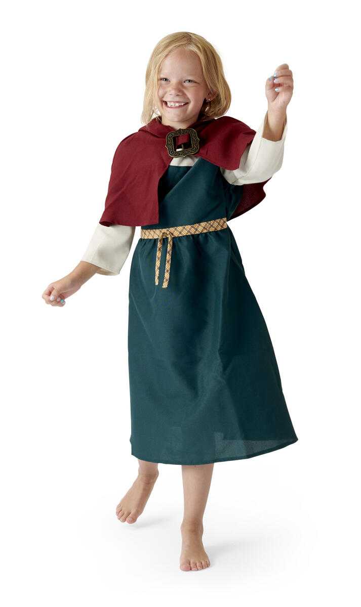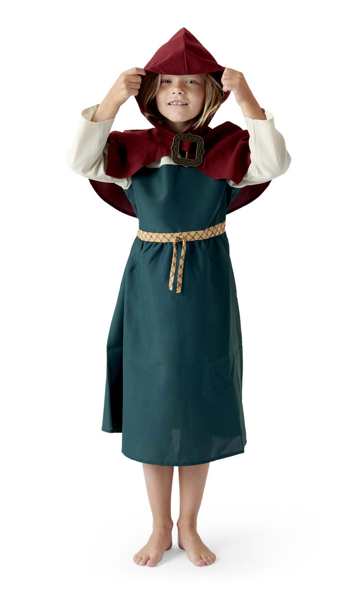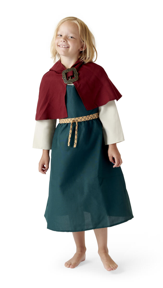 Asu voi olla vaikka viikinkitytön puku. Puku on yksinkertainen, mutta hyvin tehty. Kokonaisuus sisältää mekon ja lyhyen, hupullisen viitan. Polyesteria. Konepesu 40°C. Soveltuu 5 - 7 -vuotiaille.