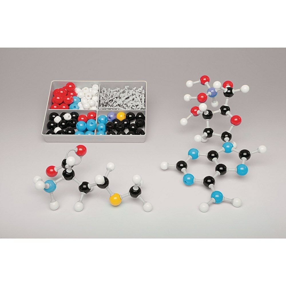Molekyylimallit orgaaniseen ja epäorgaaniseen kemiaan. Kalsium, magnesium, beryllium, kolme erilaista metalliatomia, halogeenit, happi, boori, typpi, rikki, fosfori, vety ja hiili. Sarjan atomeissa on reiät erilaisille sidoksille.