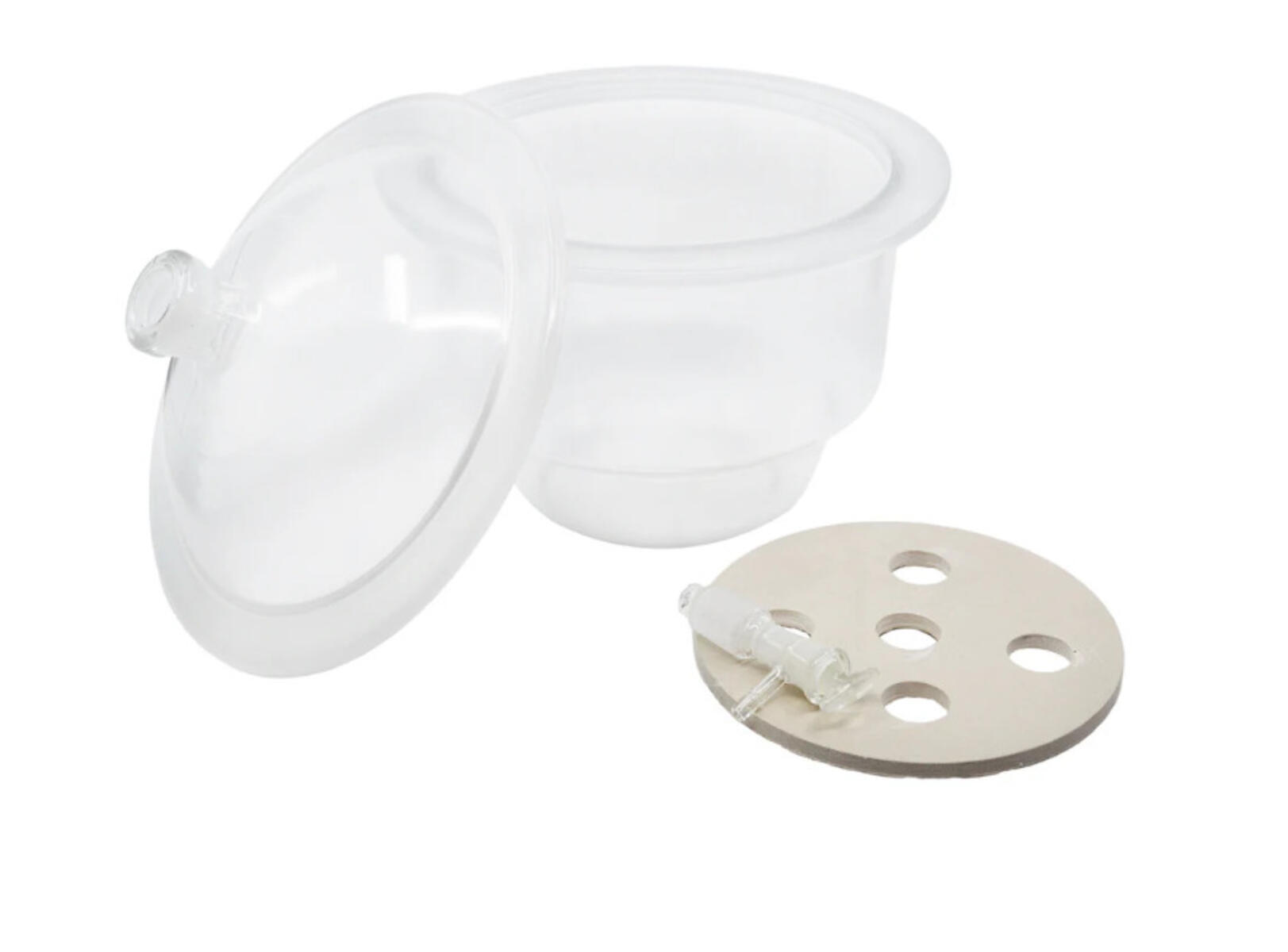 Aineiden kuivaamiseen ja varastointiin tyhjiötilassa tai inkubointiin määriteltyjen kaasuseosten alla. Mitat: sisähalkaisija 20 cm, ulkohalkaisija 26,5 cm, kokonaiskorkeus 28,1 cm. Valmistettu borosilikaattilasista.