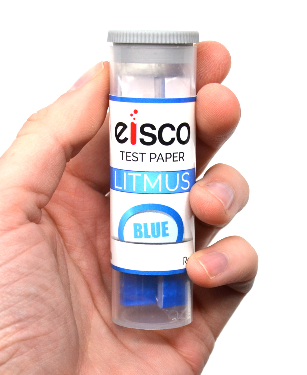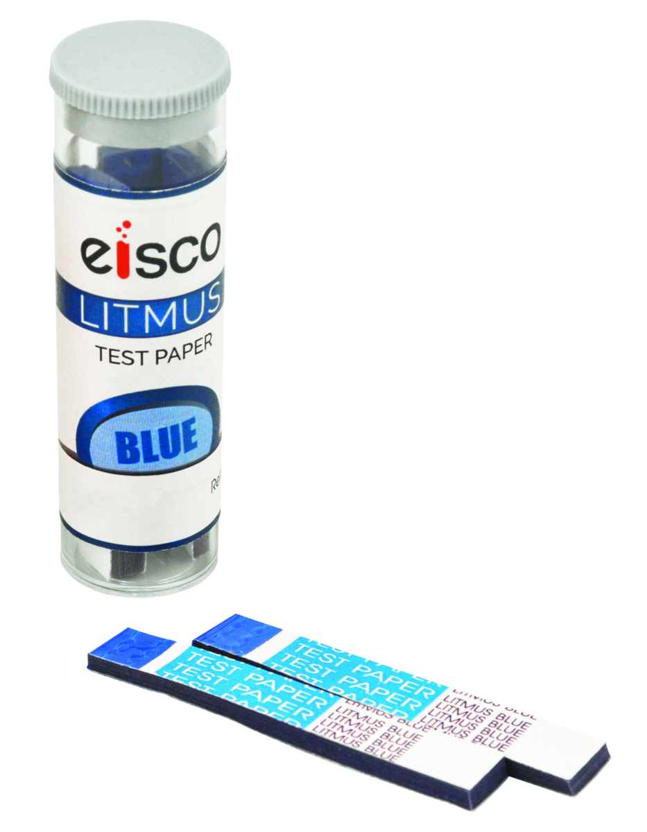 Sininen lakmuspaperi muovipurkissa. 5 vihkoa, kussakin 20 liuskaa. Mitat: 63,5 x 10 mm.