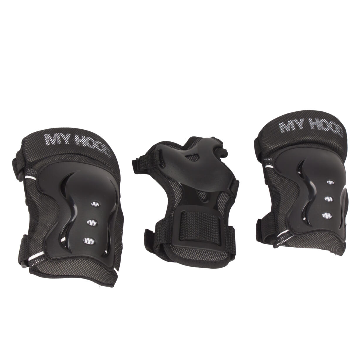 6 osaa. Mukavat suojukset nuorille skeittaajille, sopii myös potkulautailijoille, pyöräilijöille jne. Setti sisältää ranne-, kyynärpää- ja polvisuojat tarranauhoilla. Testattu EN14120. Materiaali: EVA, polyesteri ja PP-muovi. Mitat: ranteen ympärys: 14-17 cm, kyynärpään ympärys: 21-24 cm, polven ympärys 24-28 cm. Sopii 8-11 -vuotiaille, joiden paino on 25-40 kg.