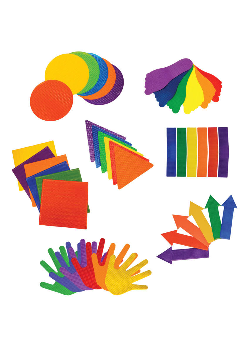 12 paria (6 paria käsiä ja 6 paria jalkoja). Merkeillä on helppo tehdä lattialle erilaisia ratoja harjoituksia ja leikkejä varten. 6 eri väriä. Valmistettu liukumattomasta kumista. Voidaan käyttää myös ulkona. Materiaali: TPE. Yli 3-vuotiaille.
