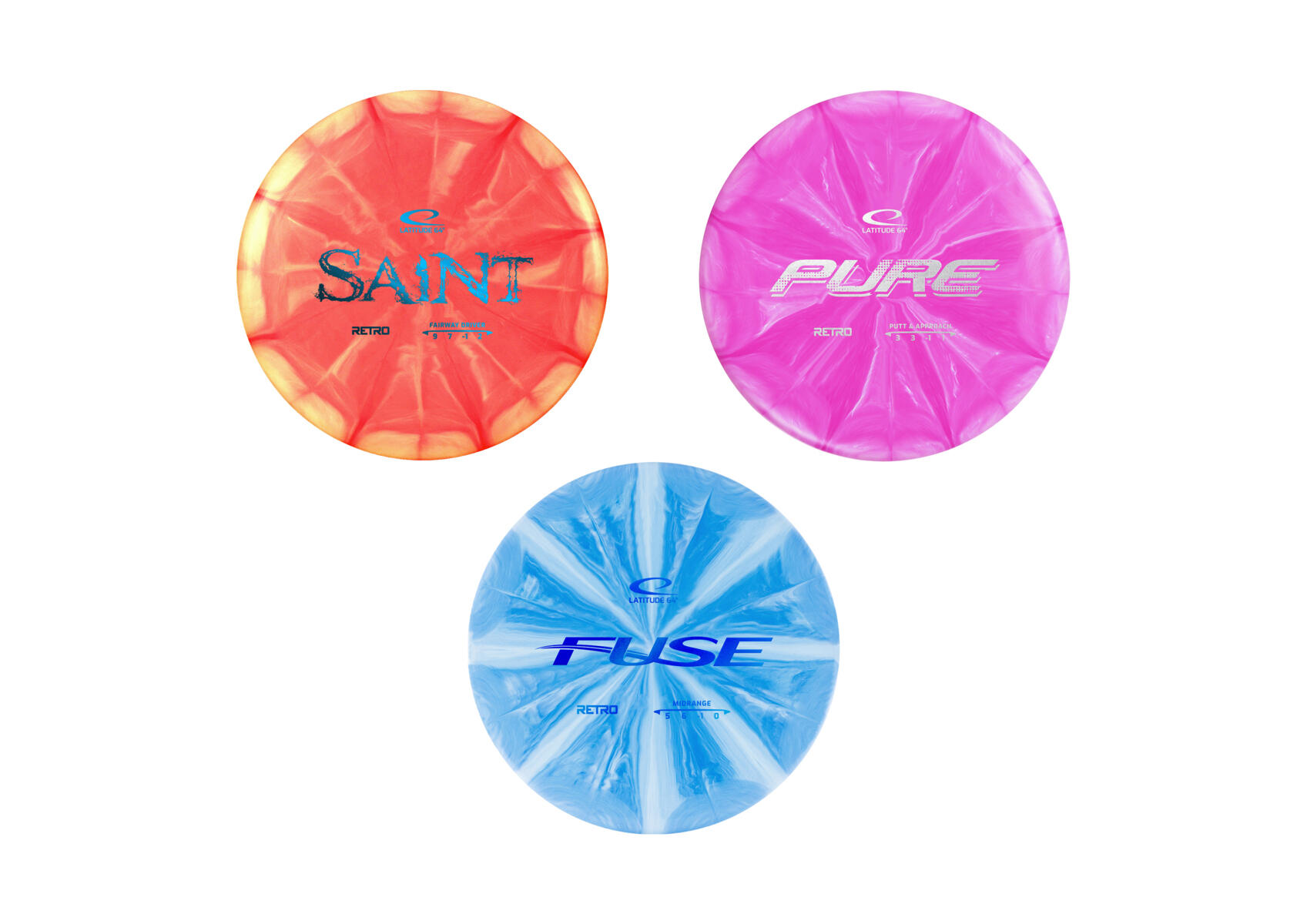 Setissä Putter, Mid Range ja Driver. Latitude 64° Retro-sarjaa. Korkeatasoiset PDGA-hyväksytyt kiekot. Retroplast-muoviseos takaa hyvän pidon kaikissa olosuhteissa. Lajitellut värit. Paino 173-176 g, ø 21,2 cm. TPE-muovia.