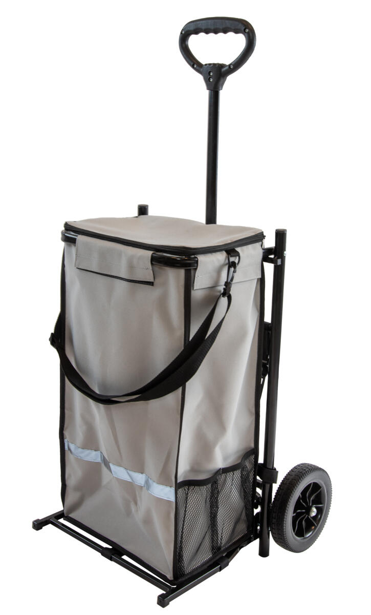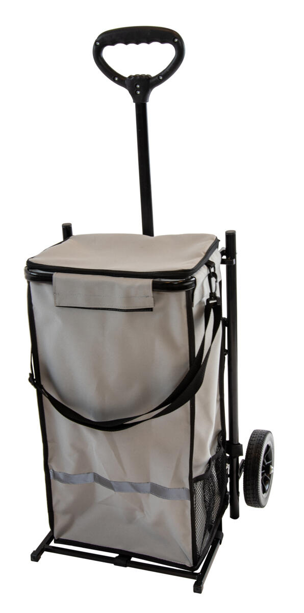 Käytännöllinen ostoskärry. Puhkeamattomat renkaat kuulalaakeripyörillä, jotka saavat kärryn rullaamaan helposti. Laukku suojaa hyvin sateelta, siinä on suljettava kansi sekä se voidaan irrottaa rungosta ja kantaa kahvasta tai olkahihnalla. Taitettava alumiinirunko. Mitat: 24 x 30 x 60 cm. Suuri 43 litran säilytystila ja pienempi ulkotasku edessä. Renkaiden koko 16 cm. Kahvan korkeus 104 cm. Maksimikuorma 50 kg. Valmistettu polyesteristä ja PEVA-muovista.