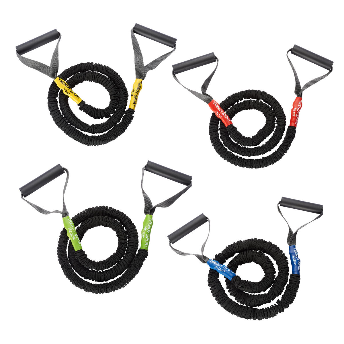Kahvalliset vastuskuminauhat monipuoliseen lihaskuntoharjoitteluun. Kuminauhan ympärillä suojaava kangas, joka estää kulumista ja lisää käyttöikää, Pituus 1,3 m. Lateksia. Setti sisältää vastukset light, medium, strong ja extra strong.