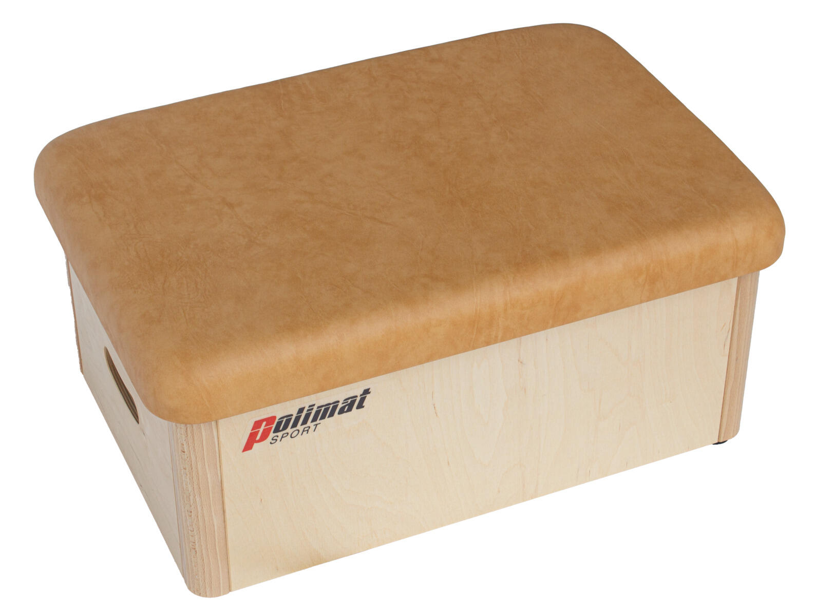 Hyppyjakkara vaneria, pyöristetyt kulmat kovapuuta, päällinen keinonahkaa. Mitat: 50 x 30 x 30 cm.