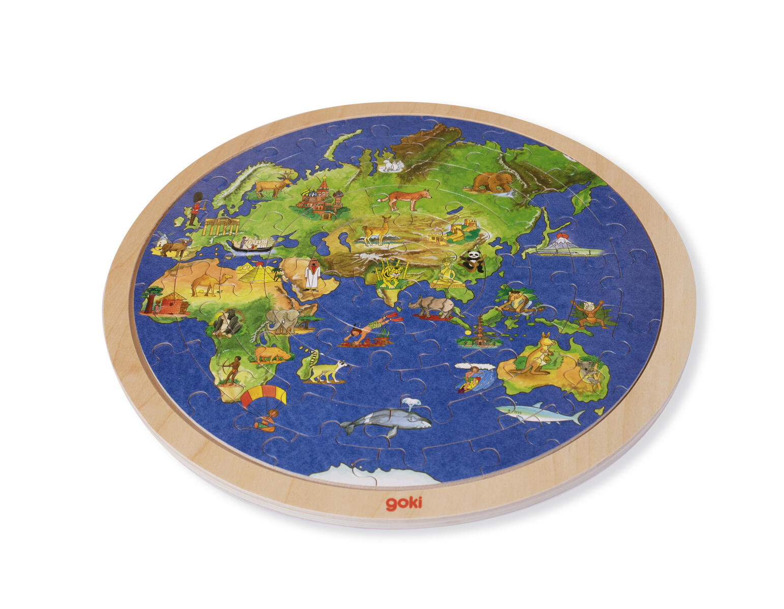 57 palaa. Puinen palapeli, jossa on maailmankartta-aihe. Painettu molemmille puolille. Yli 6-vuotiaille.