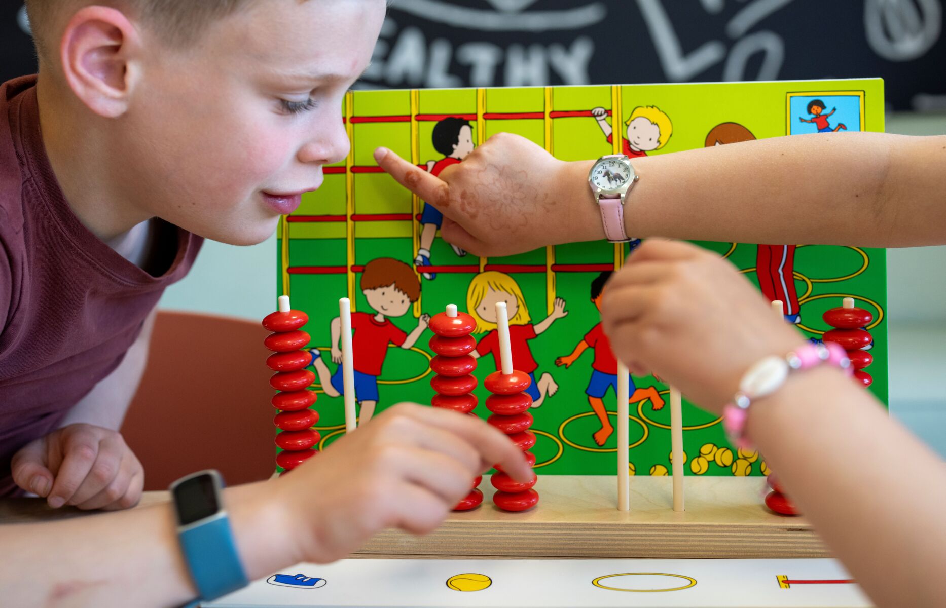 Aseta yksi teemakorteista pidikkeeseen sekä vastaava tehtäväkortti ja helmet sen viereen. Laske kuinka usein tehtäväkortin kuvat ovat teemakortilla. Laita sama määrä helmiä tikkuihin. Tarkista vastauksesi kääntämällä tehtäväkortti ympäri. Harjoitukset vaihtelevat vaikeudeltaan. Matematiikan lisäksi lapset harjoittavat hienomotorisia taitoja ja kielitaitoja. Sisältö: 6 teemakorttia, 6 tehtäväliuskaa, 120 muovihelmeä, 2 puista pidikettä korteille ja helmille sekä puinen säilytyslaatikko. Mukana englanninkielinen käyttöohje. Puulaatikon mitat: 33,5 x 22,5 x 7 cm. Yli 4-vuotiaille.