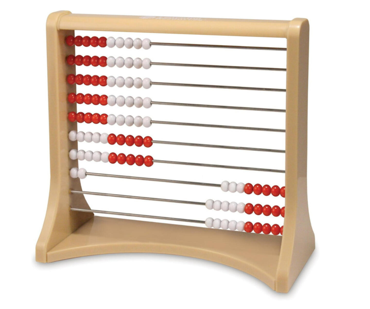 Puinen helmitaulu. Joka rivillä 5 punaista ja 5 valkoista helmeä. Mitat: 24 x 20 cm, puukuulat ø 1 cm.