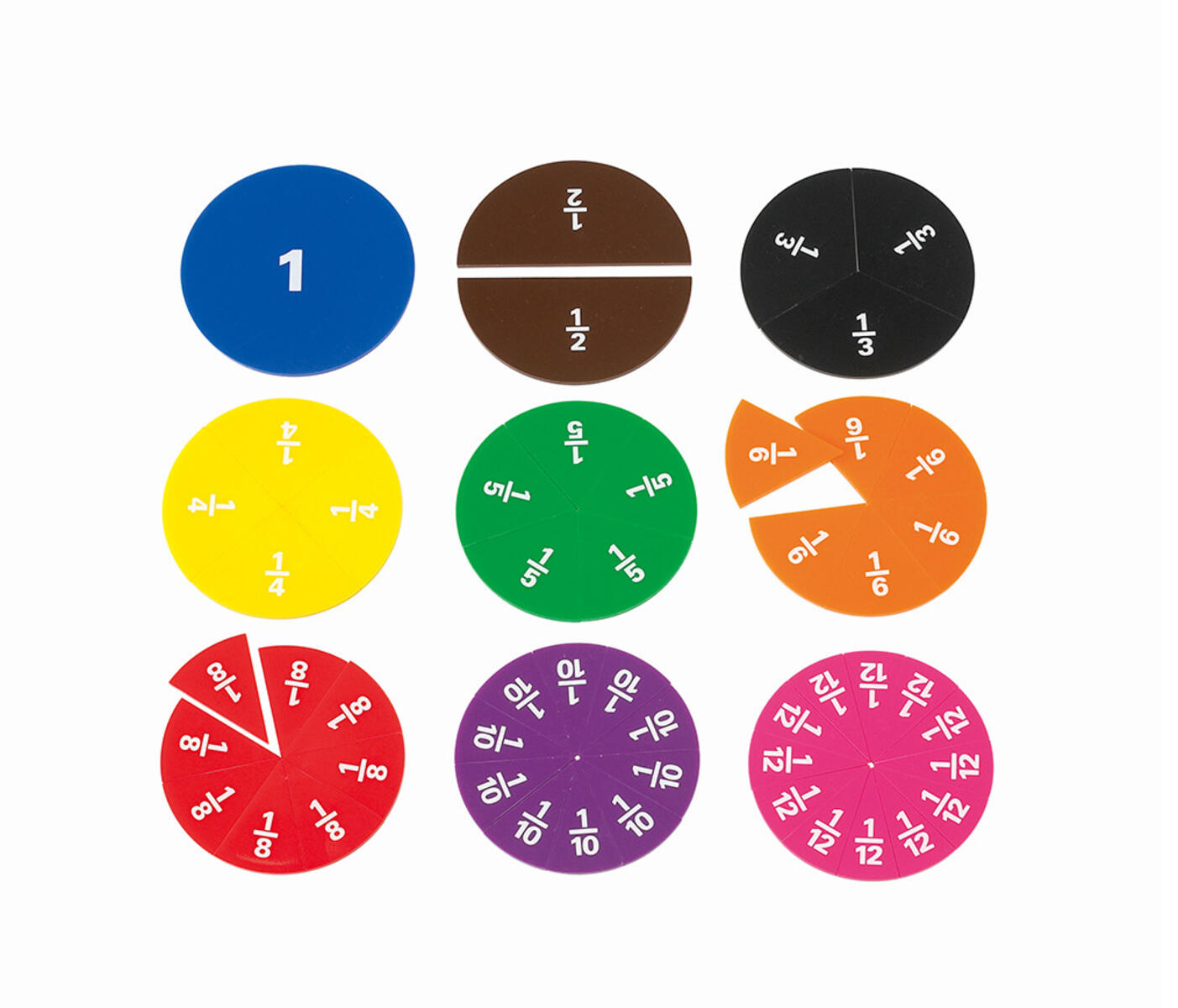Murtolukuympyrät 9 eri värissä. Luvut 1, 1/2, 1/3, 1/4, 1/5, 1/6, 1/8, 1/10 ja 1/12, yhteensä 51 osaa. Ø 8,7 cm. Polystyreenimuovia.