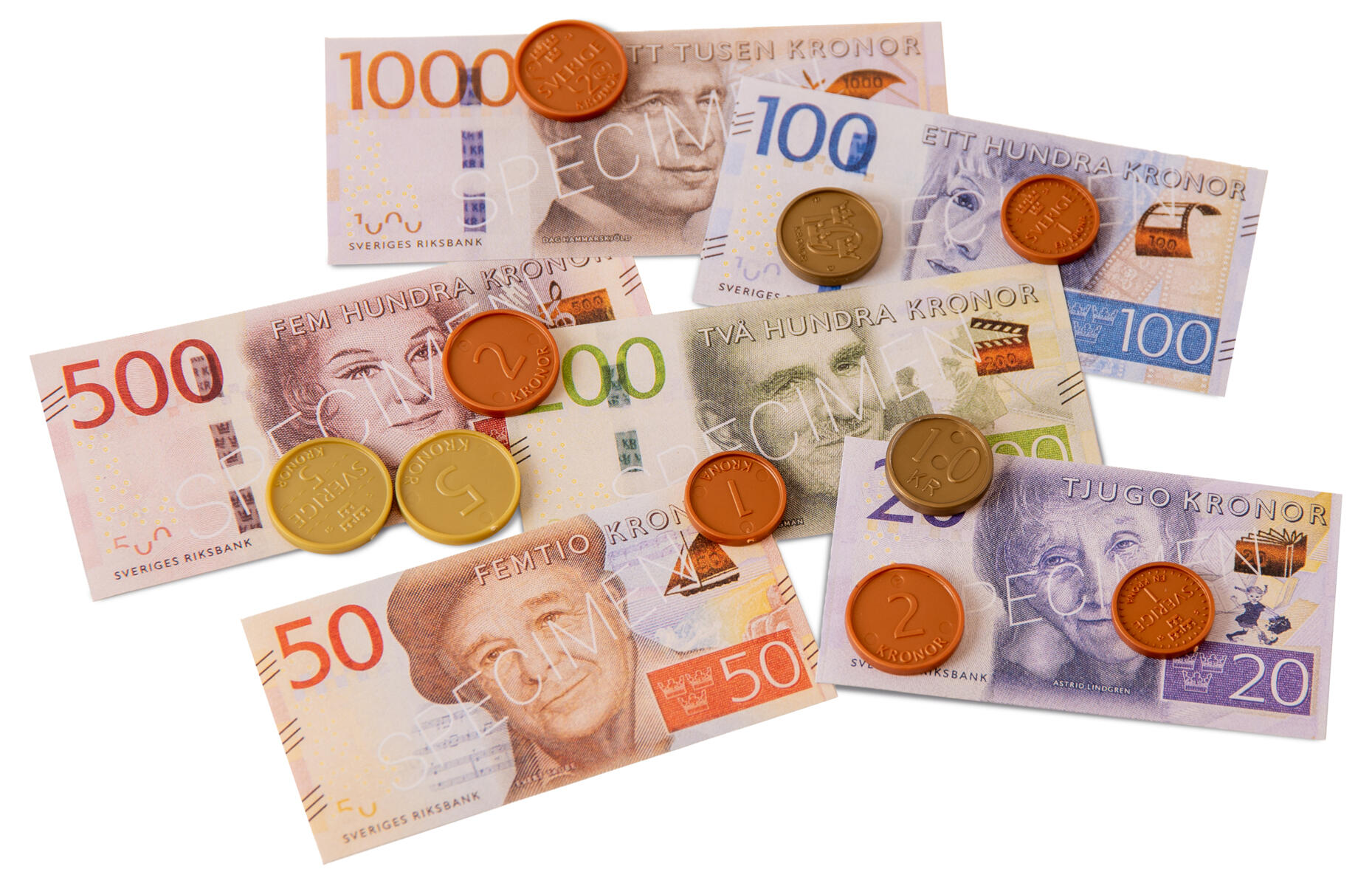 Lajitelmassa 1 pakkaus kutakin seteliä ja kolikkoa. Kolikot muovia, aitoa kolikkoa paksumpia, halkaisijaltaan aidon kolikon kokoisia. Seteleissä molemminpuolinen neliväripainatus. Kooltaan 80 % aidosta setelistä. Yli 3-vuotiaille.