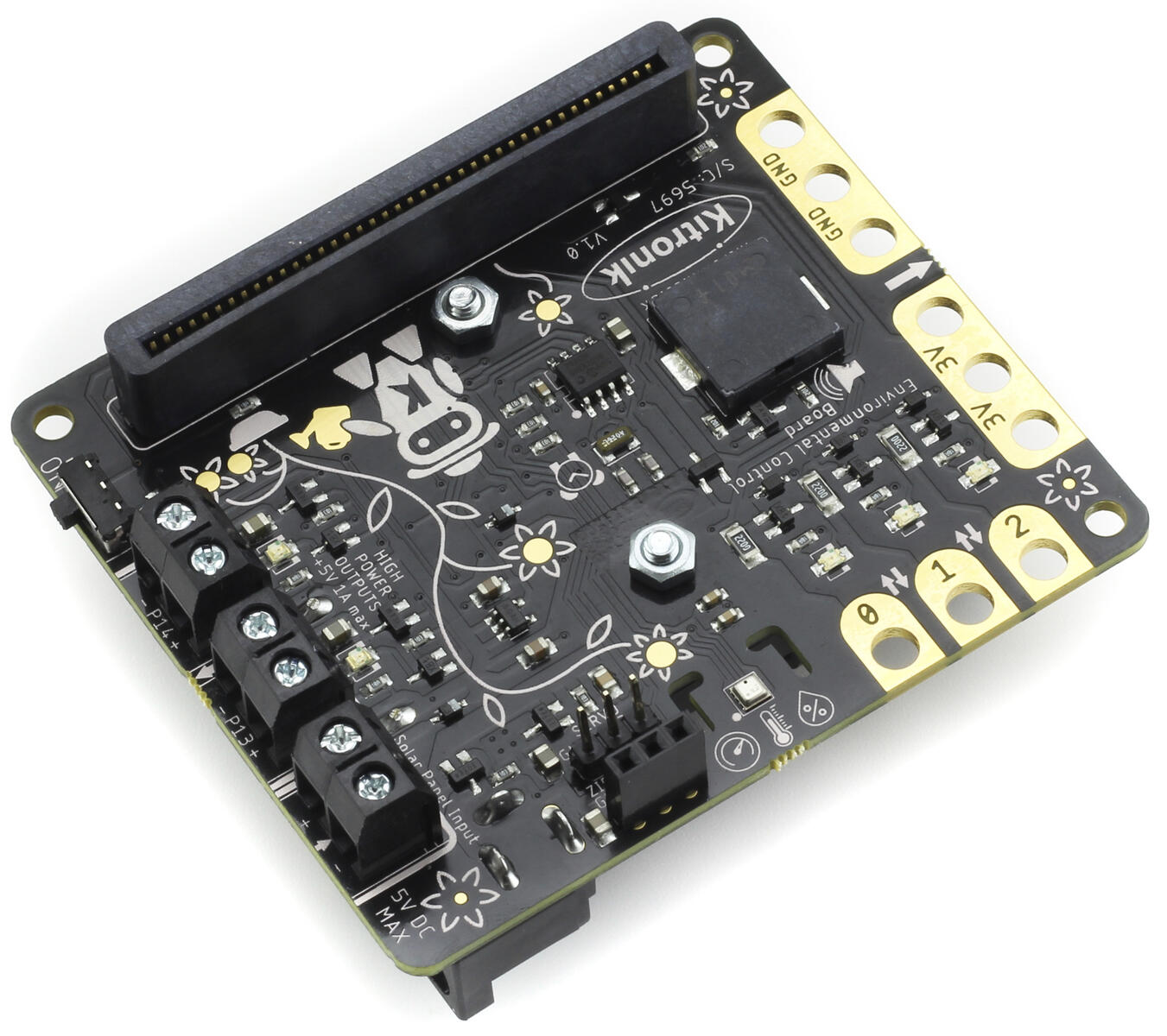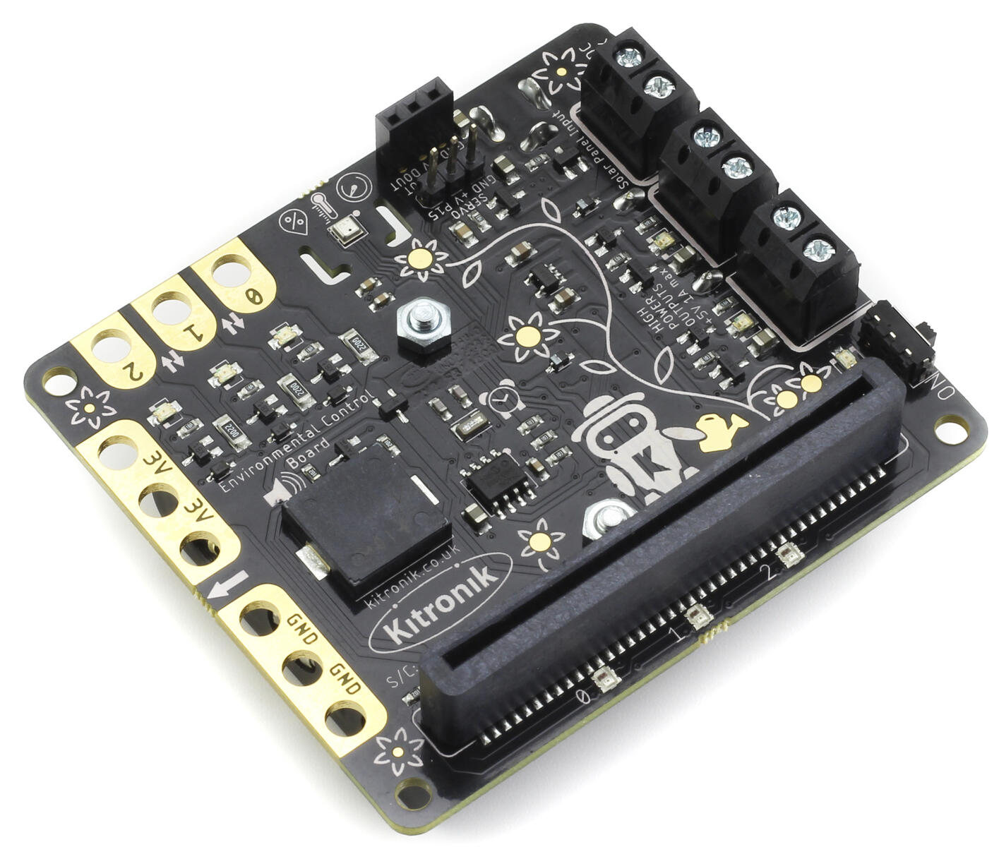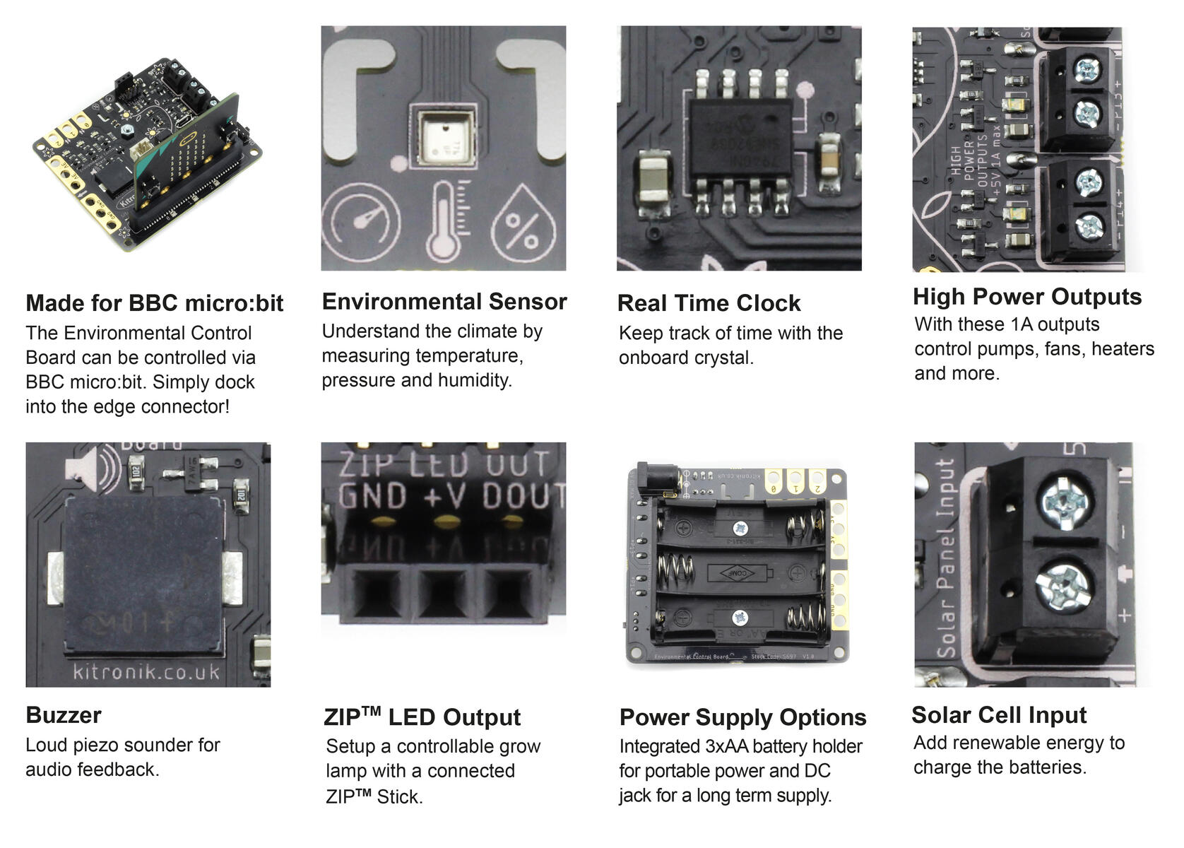 Kitronikin Environmental Control Board tarjoaa useita erilaisia vaihtoehtoja koskien antureita ja liitäntöjä Micro:bit V1:een ja V2:een ja antaa samalla opiskelijoille mahdollisuuden ohjata ulkoista ympäristöä mm. vesipumppua tuuletinta, servoa tai lämmitintä. Piirilevyssä on myös tulo aurinkokennoille ja myös mahdollisuus ladata ladattavia akkuja. Katso lisätietoja tuotelortista (engl.).