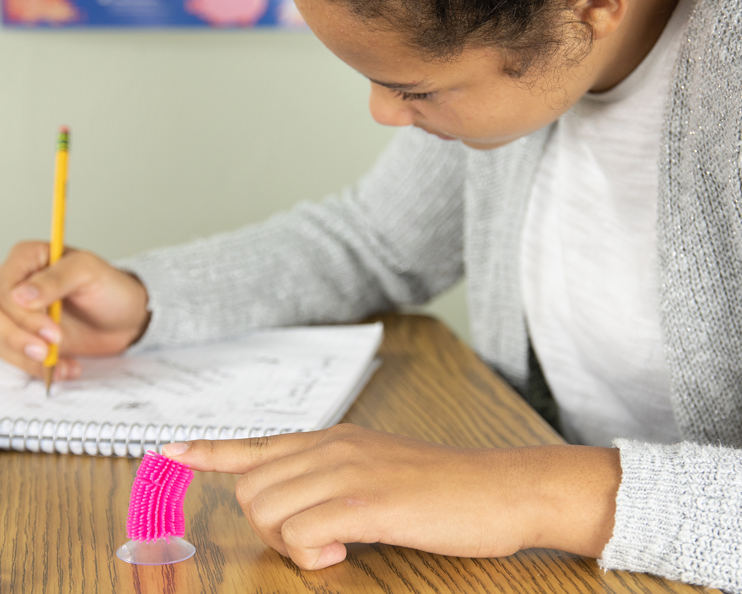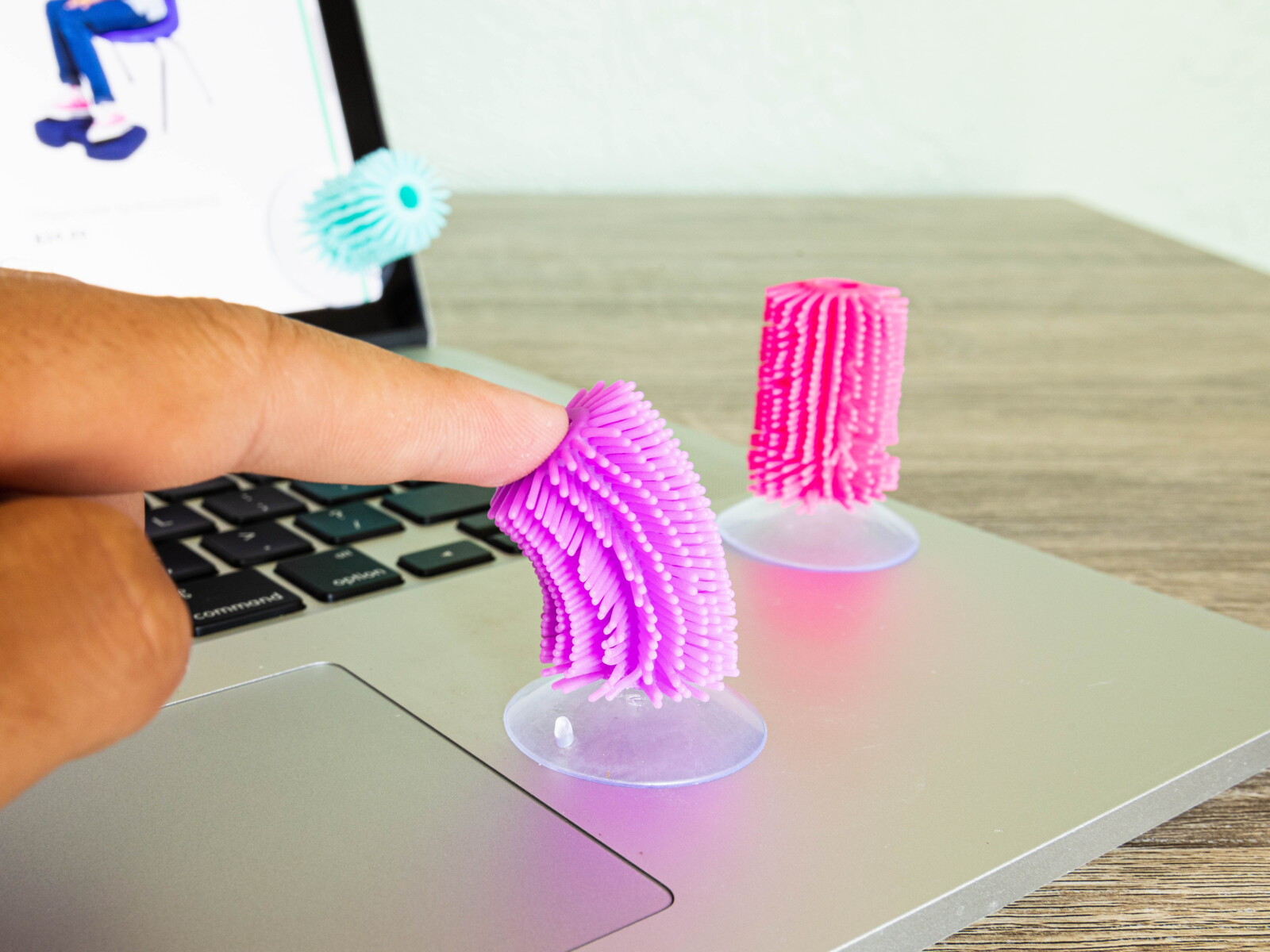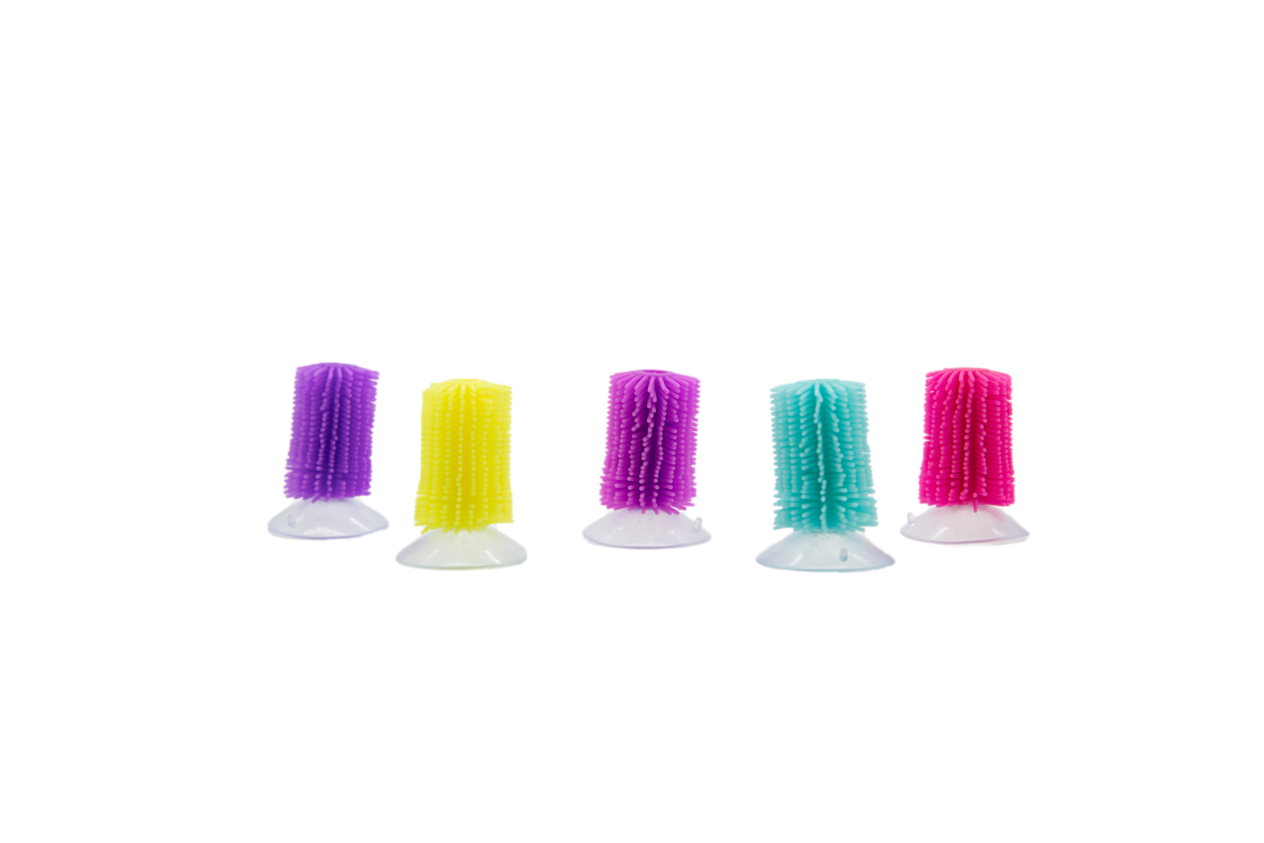 Hiljaiset ja rauhoittavat pienet pehmeät harjat, jotka kiinnitetään pöytälevyyn imukupilla. Kun annat levottomien sormin liikkua, on helpompi keskittyä. Lajitellut värit. Mitat: 5 x 2,5 cm.
