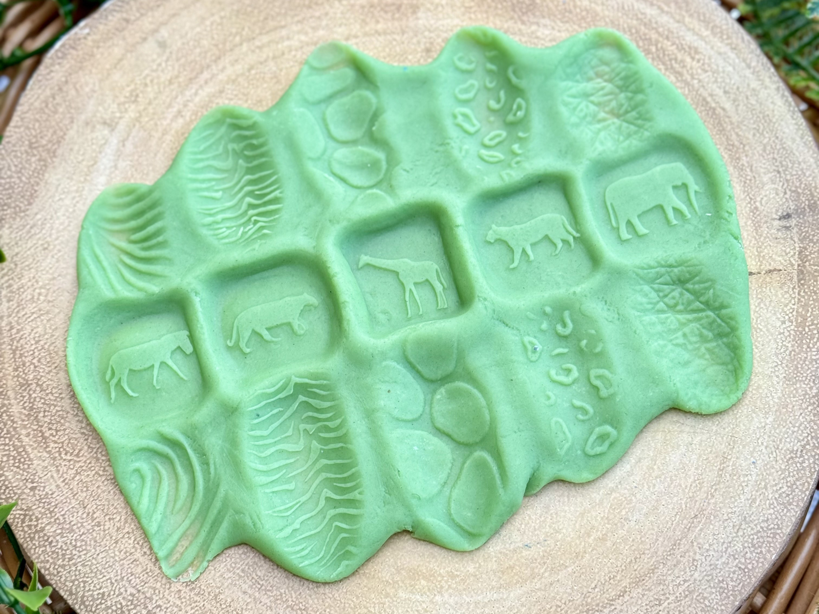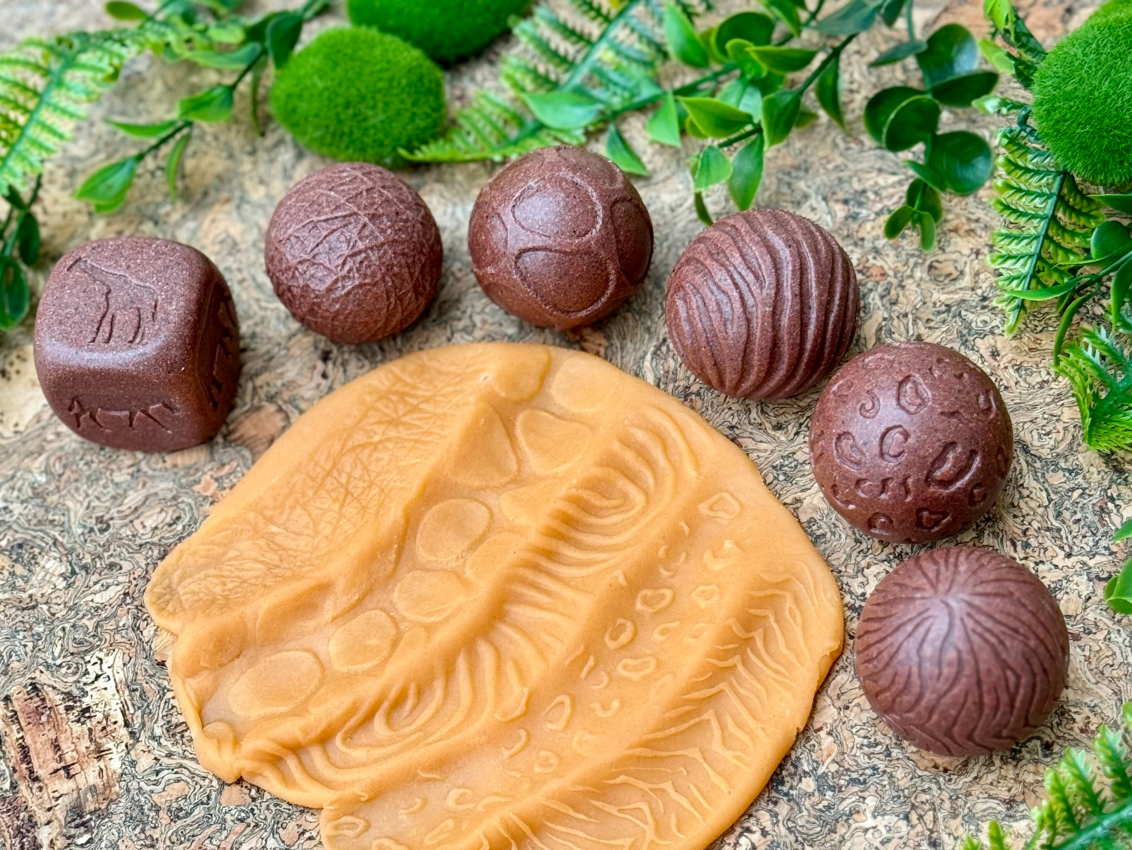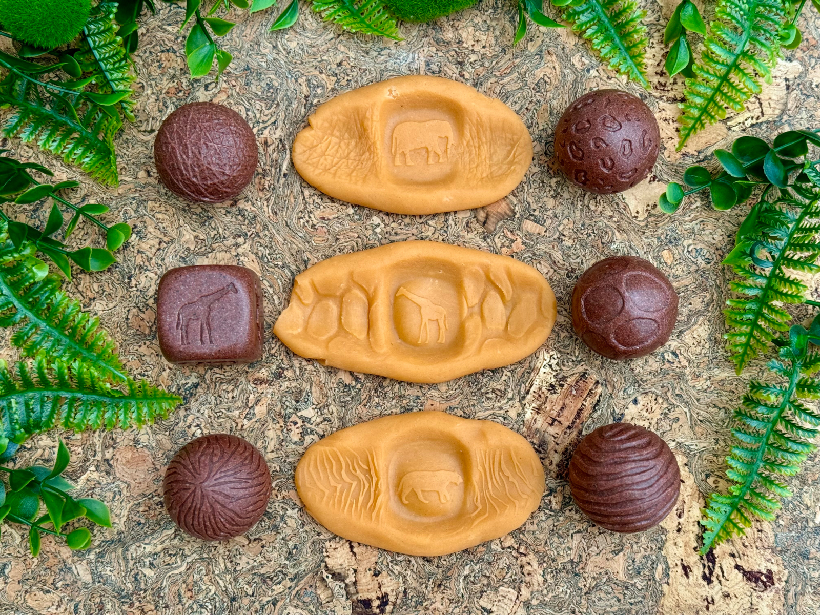 Katso villieläimiä tarkemmin näiden kivikuulien avulla. Pyörittämällä niitä savessa syntyy erilaisia kuvioita. Jokaisessa kivipallossa on kuvio jonkin eläimen nahasta/turkista ja nopat näyttävät eri eläimet: kirahvi, seepra, tiikeri, leopardi ja norsu. Täydellinen "Arvaa kuka olen" -leikkiin. Kehittävät hienomotorisia taitoja ja herättävät uteliaisuutta. Sopii sekä sisä- että ulkokäyttöön. Materiaali: kivi. Mitat: 4,5 cm. Yli 2-vuotiaille.