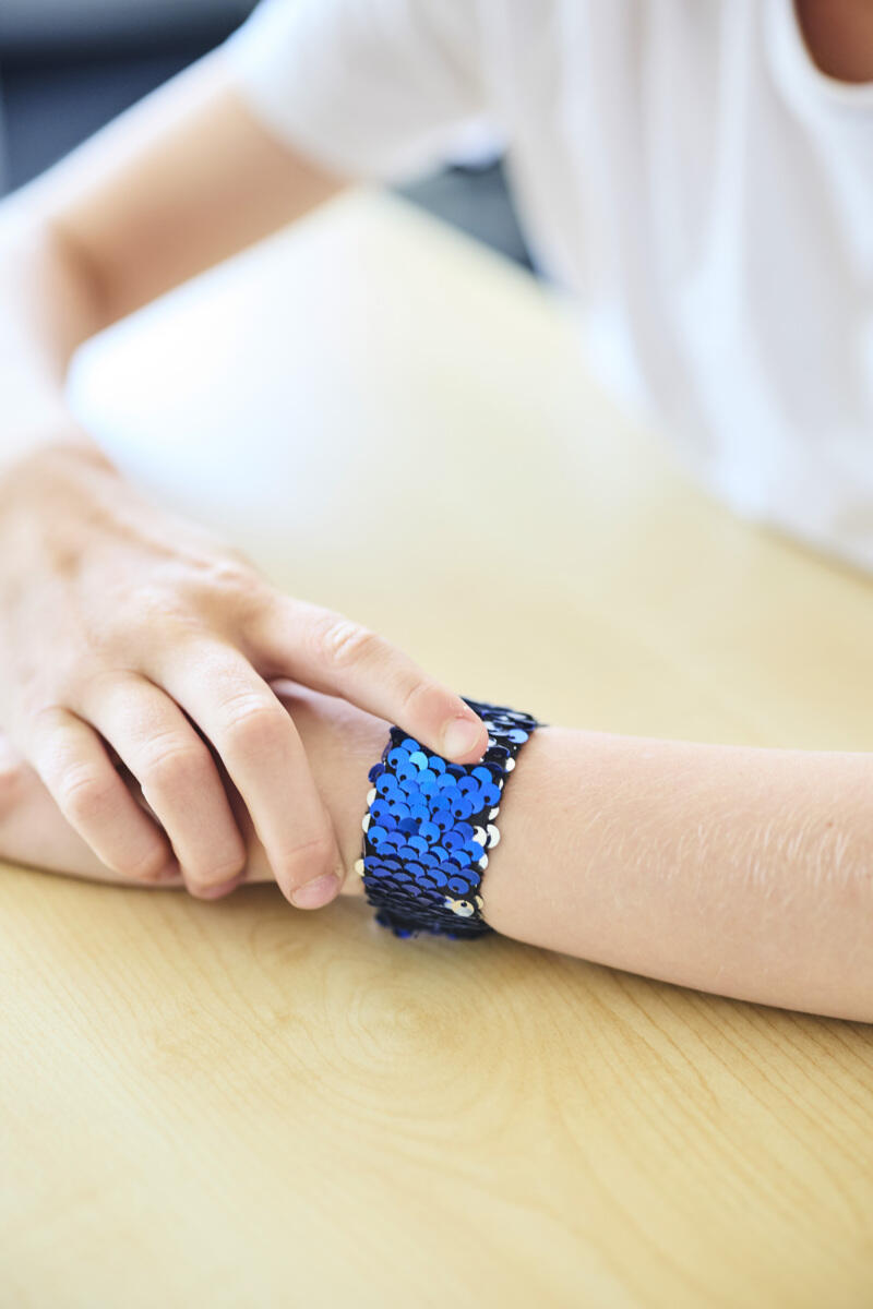 Rannekorut paljeteilla, joita voidaan käännellä ja tehdä niihin kuvioita. Lasten keskittyminen voi parantua, kun annat heidän sormien leikkiä paljeteilla. Värit voivat vaihdella. Mitat: 21 x 3 cm.