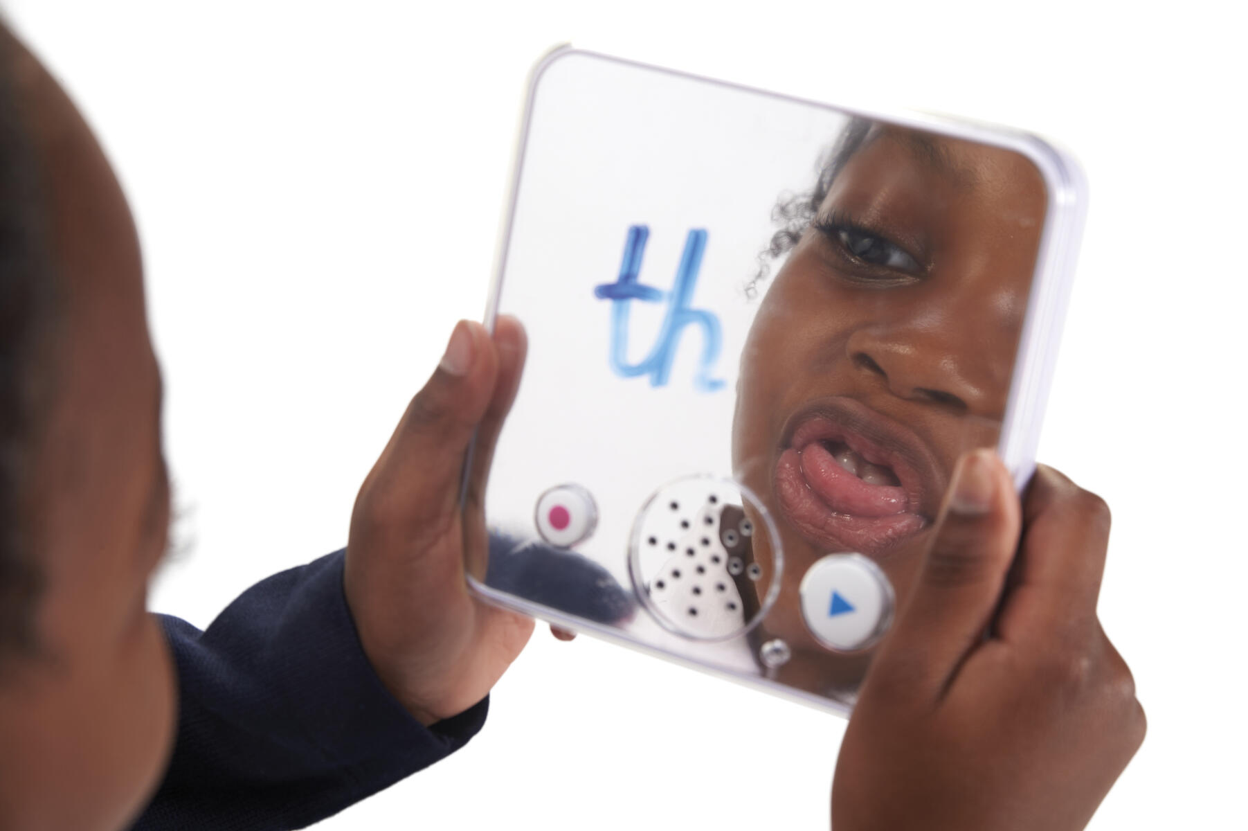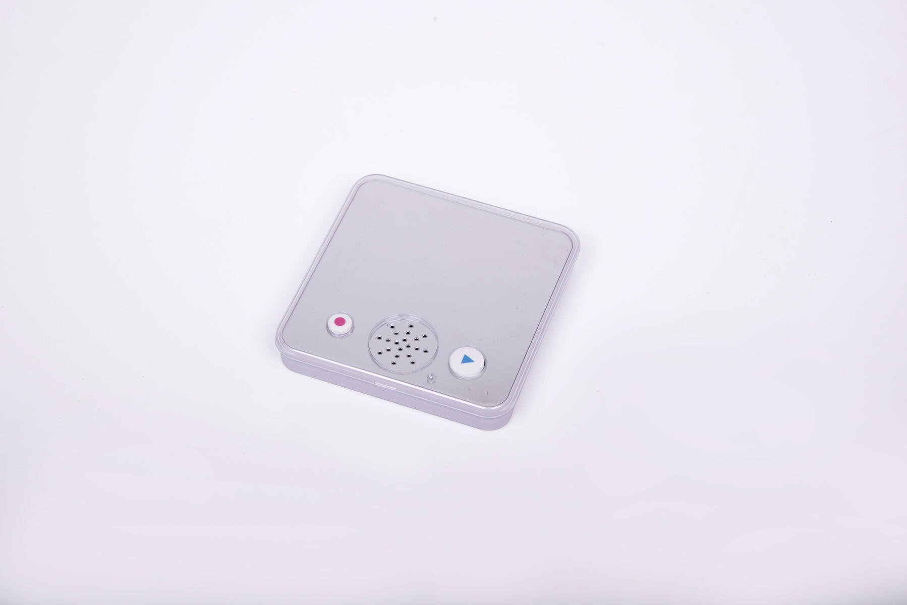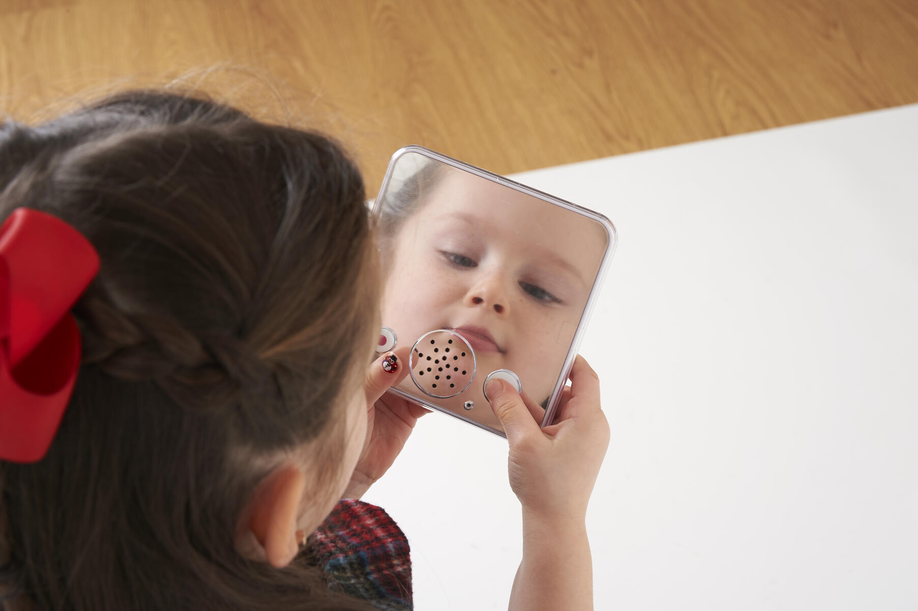 Yksinkertaisilla painikkeilla lapset voivat tallentaa jopa 30 sekunnin pituisen äänitteen ja toistaa sen sitten. Lapset voivat nähdä itsensä peilistä puhumisen aikana. Takana on valittavana kolme eri äänenvoimakkuutta ympäristöstä riippuen ja lukituspainike tallennukselle, jotta et vahingossa toista minkään päälle. Voidaan ripustaa seinälle takana olevien magneettien avulla. Vaatii 3 kpl AAA-paristoa (ei sisälly). Mitat: 12 cm.