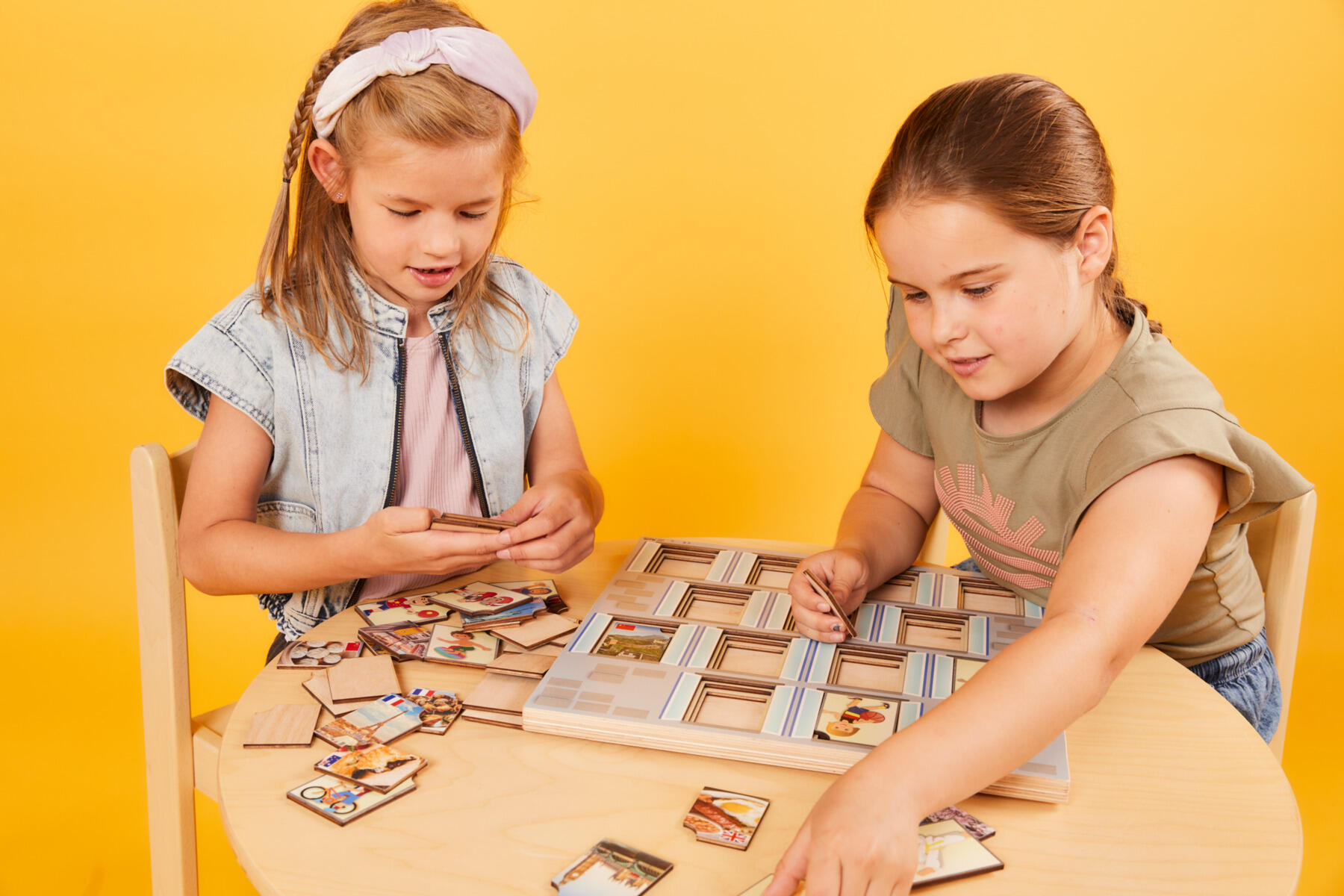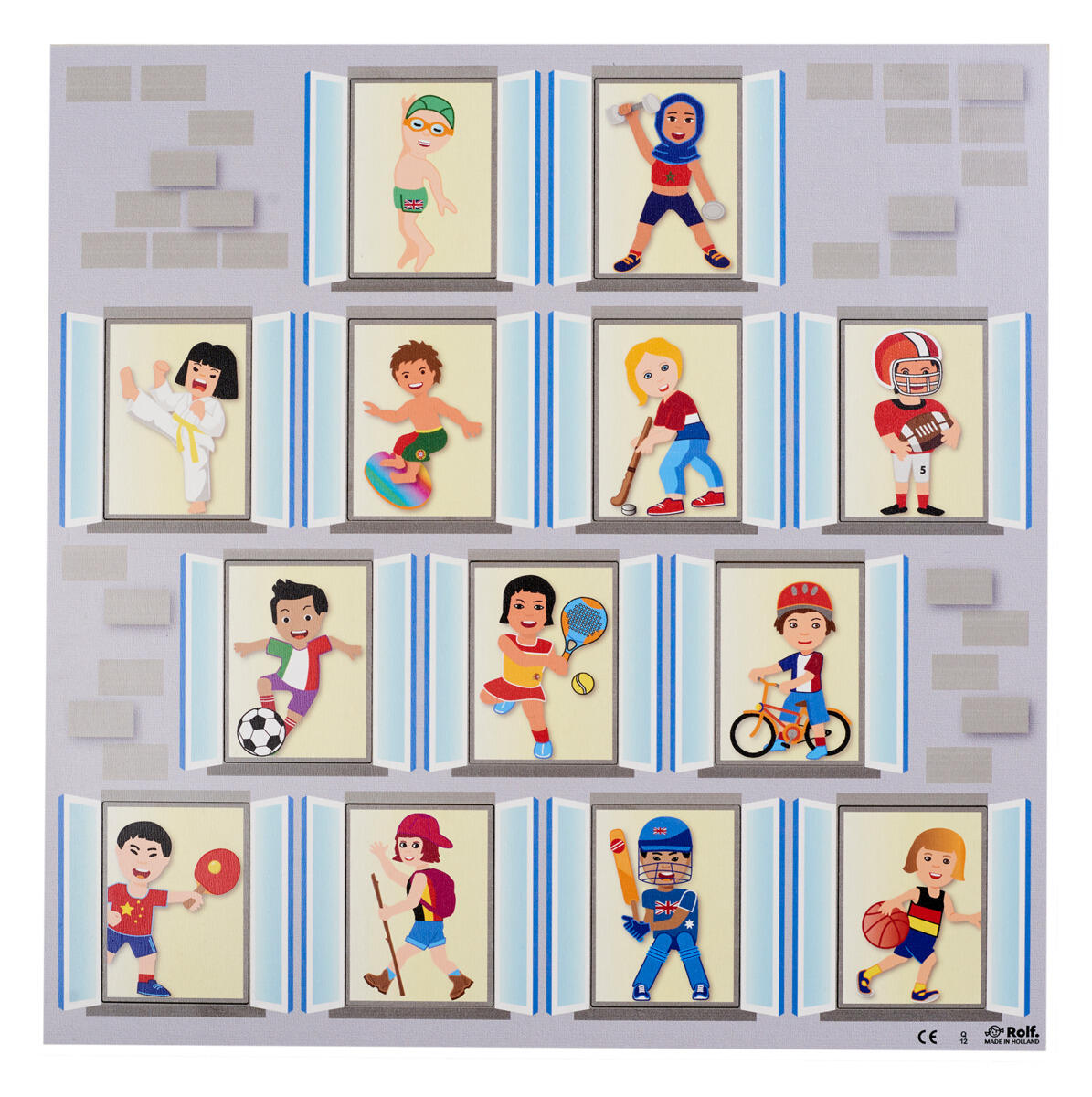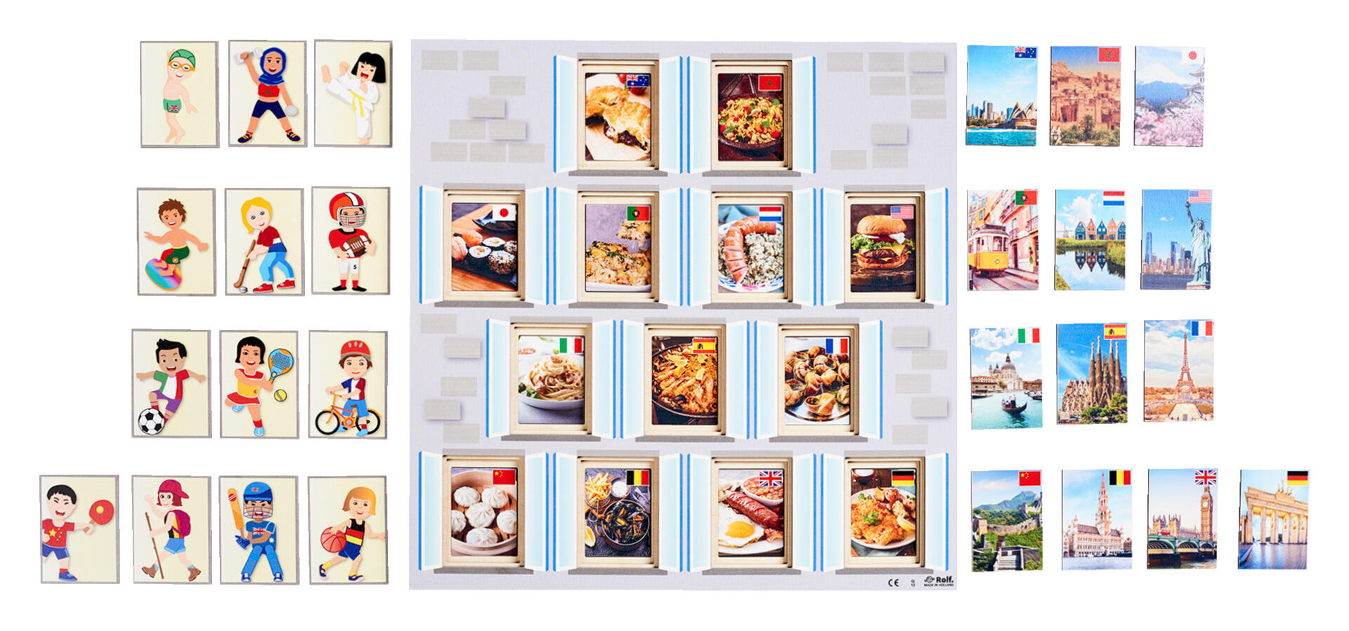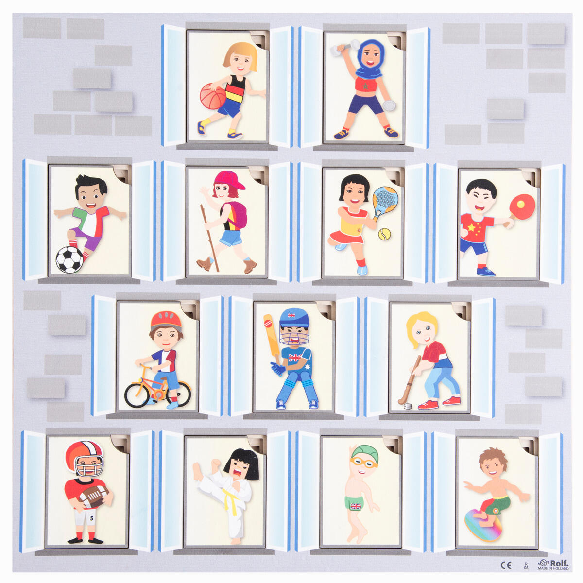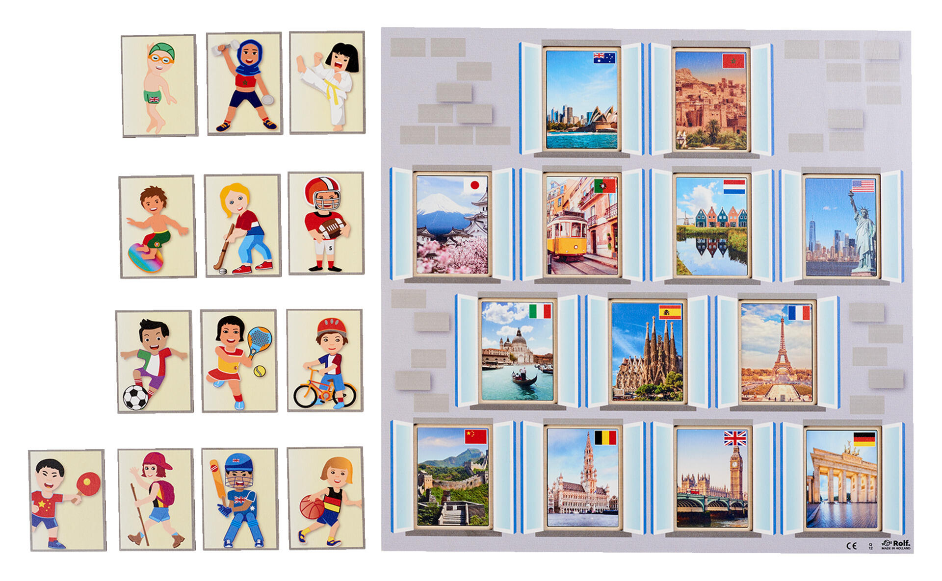 39 palaa. 13 urheilullista lasta eri maista asuu tässä talossa. Mistä maasta he ovat? Yhdistä oikea palanen lippuihin. Tutustu eri maiden rakennuksiin ja herkkuruokiin. Mitat: 37,5 x 37,5 cm. Koivua. Yli 4‑vuotiaille.