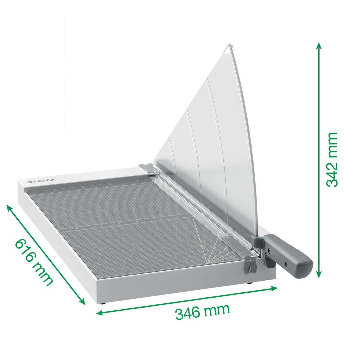 Tehokas ja helppokäyttöinen vipuleikkuri koti- ja toimistokäyttöön, sopii A3-kokoisille arkeille. Täydellinen paperin, tarrojen, kalvojen, valokuvien ja korttien leikkaamiseen. Leikkaa jopa 10 arkkia (80 g/m²) nopeasti ja tarkasti terävällä ruostumattomasta teräksestä valmistetulla terällä. Sisältää ainutlaatuisen EdgeGlow-valoteknologian, joka valaisee leikkuureunan parempaa näkyvyyttä ja maksimaalista tarkkuutta varten. Manuaalinen paperipuristin pitää paperin paikallaan ja ergonominen kahva takaa mukavan ja helpon leikkaamisen. Laminoidun työtason ruudukko- ja mittausviivojen sekä kulmaohjainten avulla paperi on helppo ja nopea kohdistaa. Turvallinen teränsuojus antaa täydellisen suojan ja turvasalpa pitää terän lukittuna, kun sitä ei käytetä. Mitat: 616 x 346 x 342 mm.