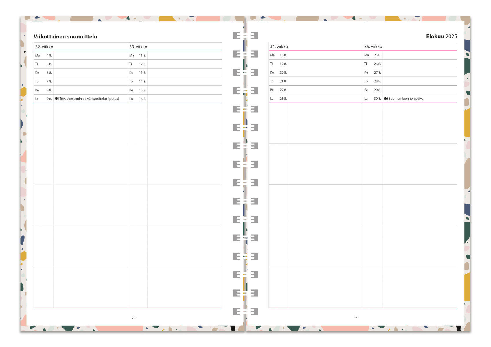 Koulunkäynninohjaajille sekä aamu- ja iltapäivätoiminnan ohjaajille. Suunniteltu yhteistyössä käyttäjien kanssa. Kalenteriosion lisäksi sisältää mm. ohjaajan omat työjärjestykset, luokan lukujärjestykset, luokan yhteystiedot, sivut kuljetusten hoitamiseen, viikoittaiset suunnittelusivut sekä runsaasti muistiinpanotilaa. Viikkoaukeama, lukuvuosijako. Takakannessa kätevä säilytystasku, kirjamerkkiläppä helpottaa tärkeän sivun löytämistä. Koko A5, 176 sivua, parikierresidottu. Ympäristöystävälliset, laminoidut kovapahvikannet. FSC-sertifioitu.