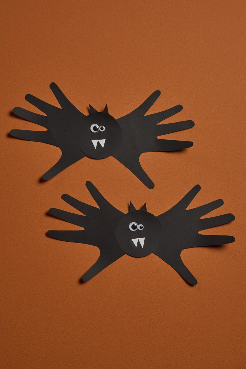 - Liimaa kiinni muovisilmät ja leikkaa lepakolle hampaat valkoisesta paperista.