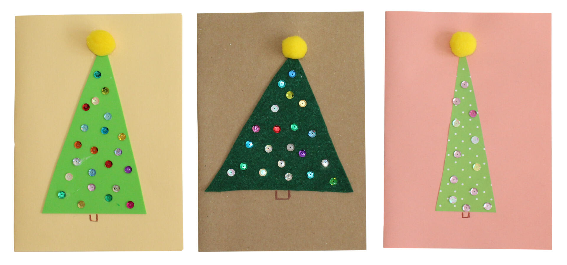 - Leikkaa vihreästä huovasta pieniä kuusia ja liimaa ne kortin etupuolelle. Anna kuivua.