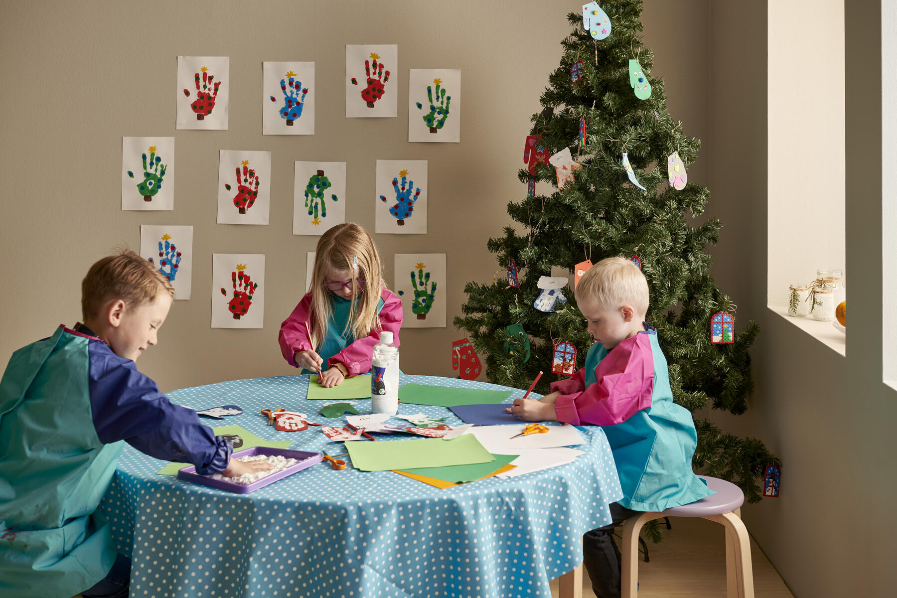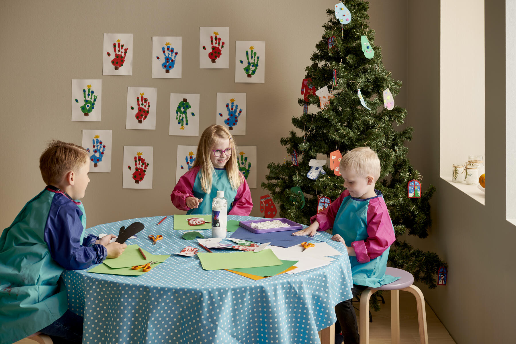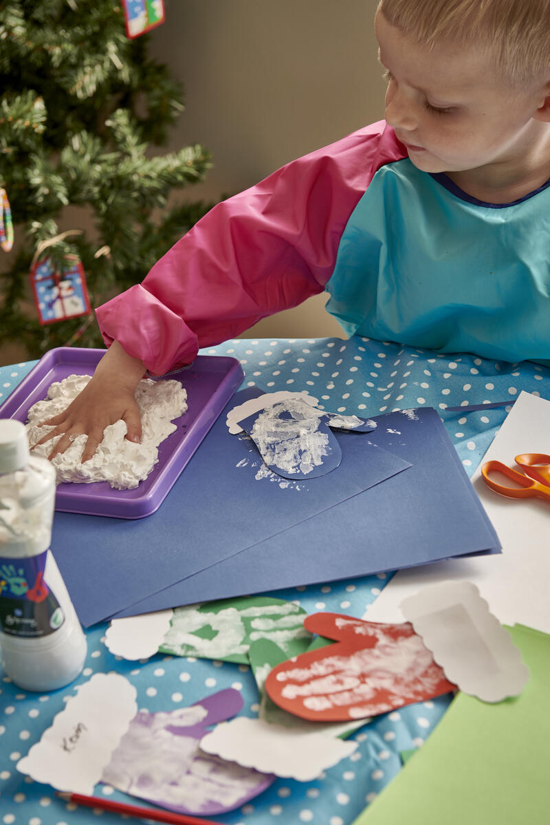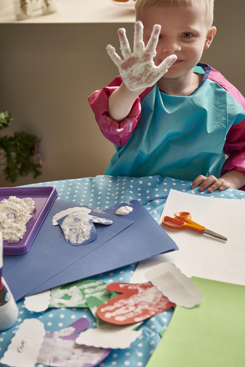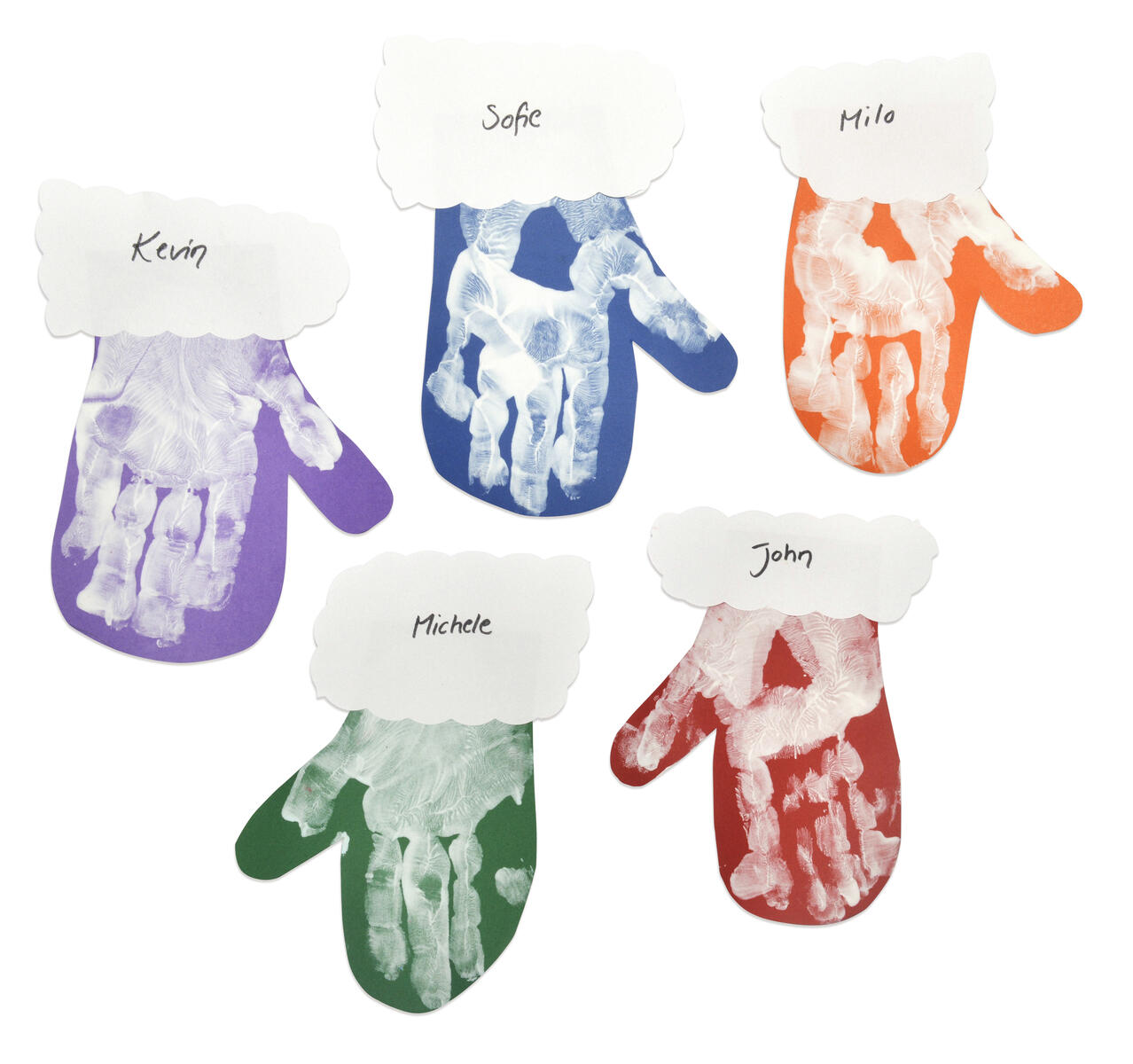Leikkaa kartongista lapasenmuotoinen kuvio. Piirrä lapaseen valkoinen kädenjälki. Leikkaa lapaselle varsi valkoisesta paperista ja liimaa lapaseen.