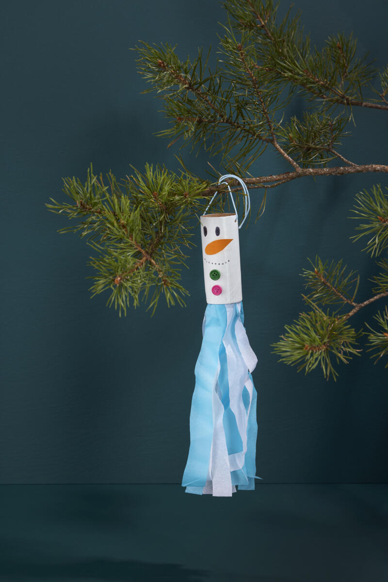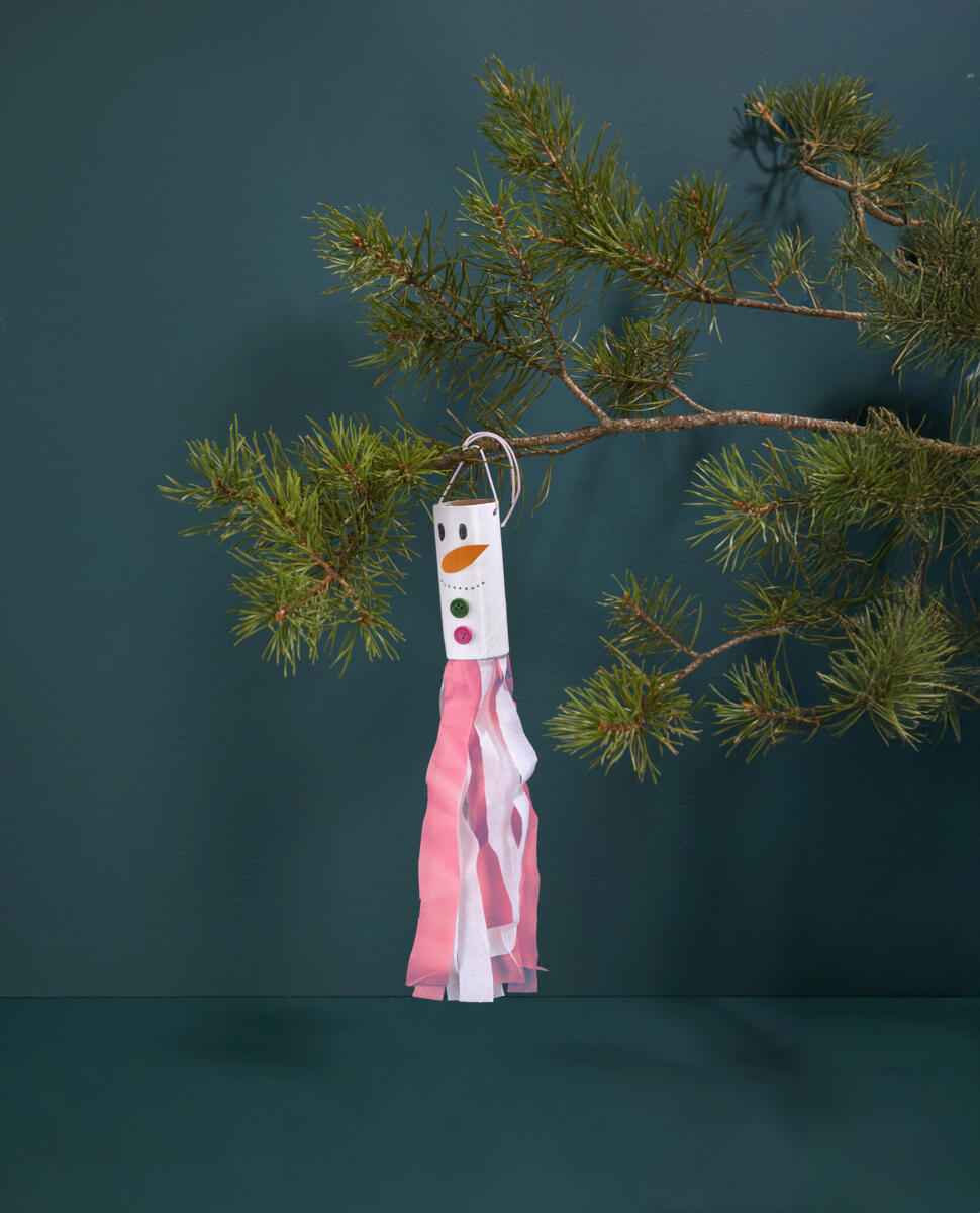 - Tee rullan sivuille kaksi reikää ja vedä naru niiden läpi, jotta lumiukon voi ripustaa esimerkiksi joulukuuseen. Teimme reiät rei'ittimellä.