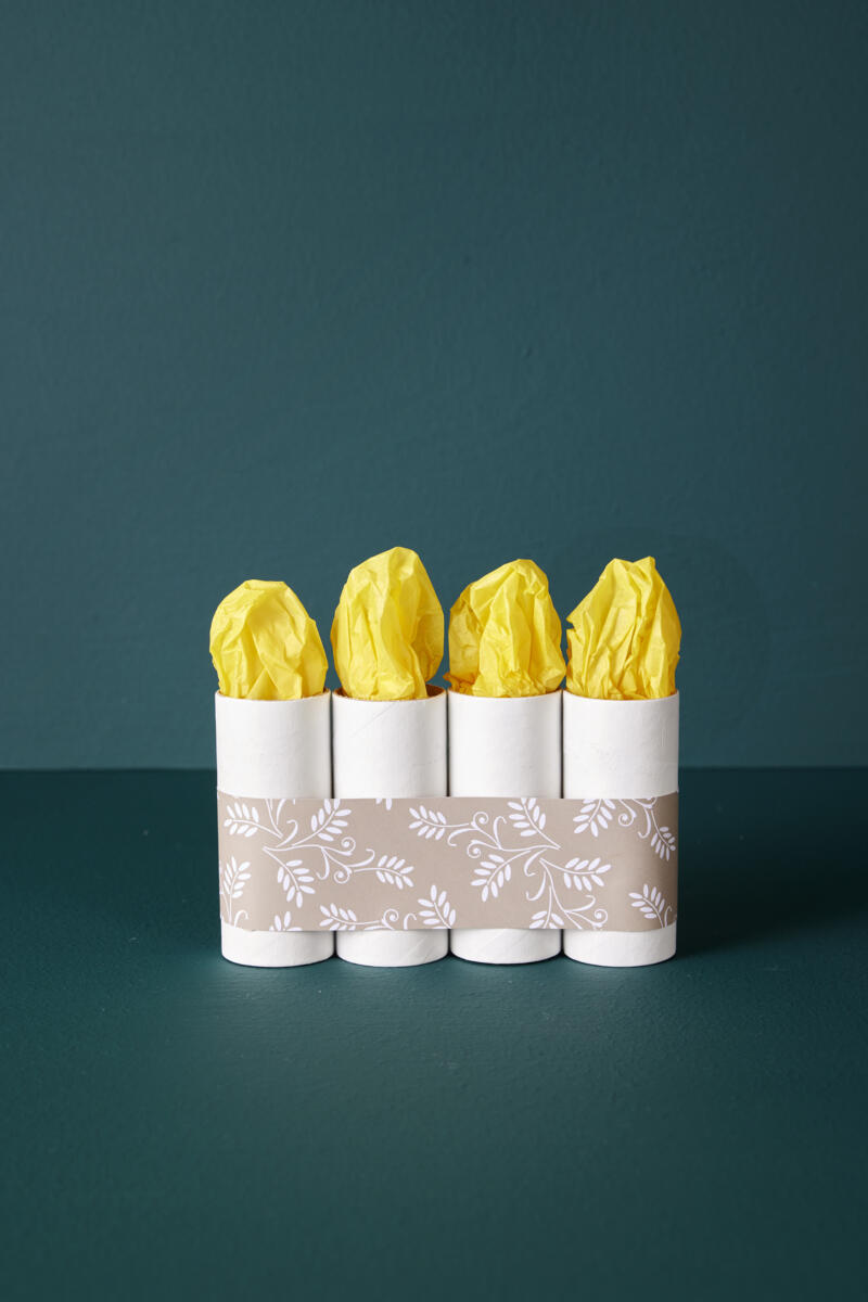 - Rypistä liekiksi hieman silkkipaperia ja laita paperirullan sisälle.